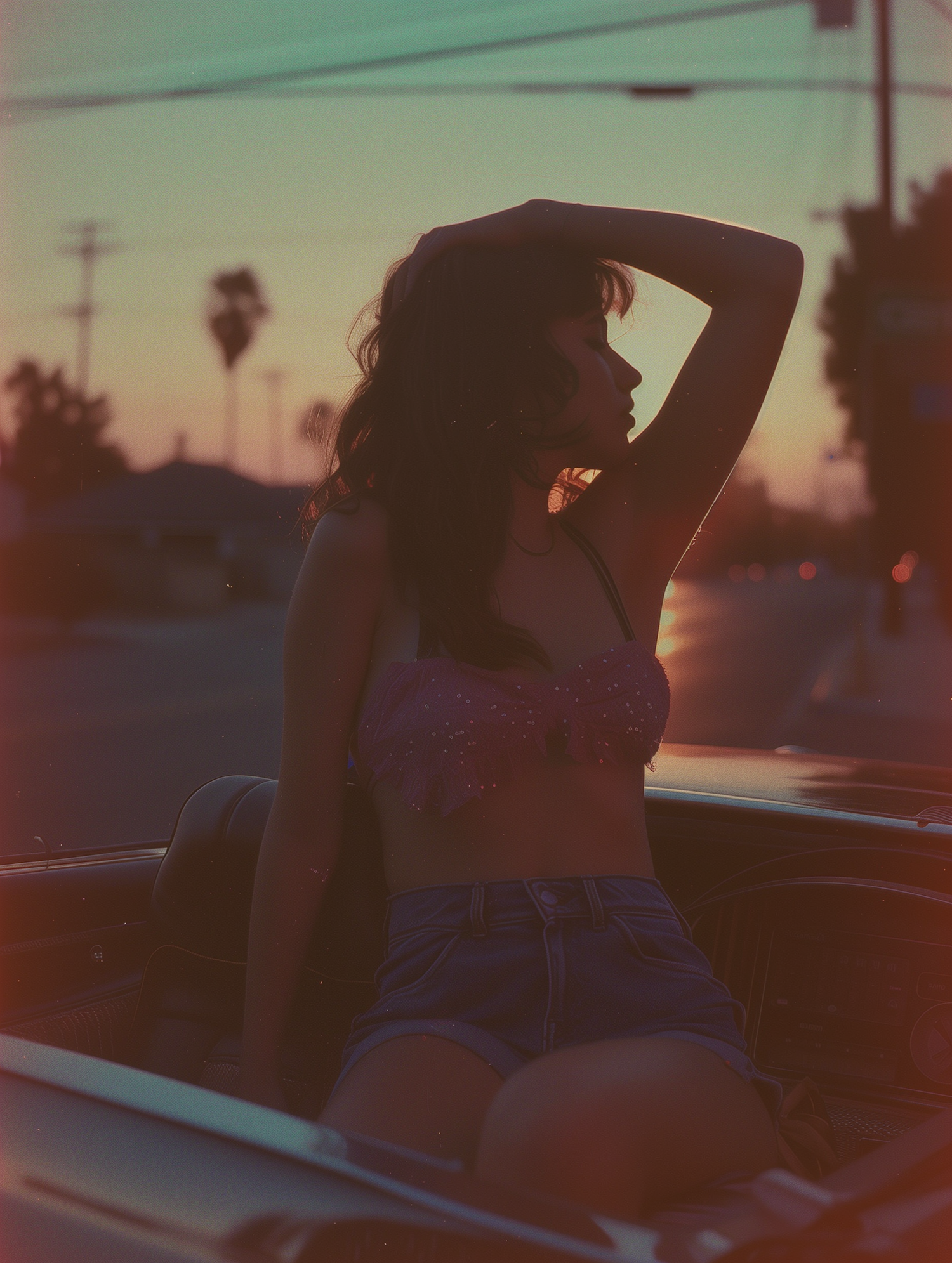 Young woman in a convertible at sunset, wearing a pink crop top and denim shorts, creating a silhouette against a warm, dreamy sky.