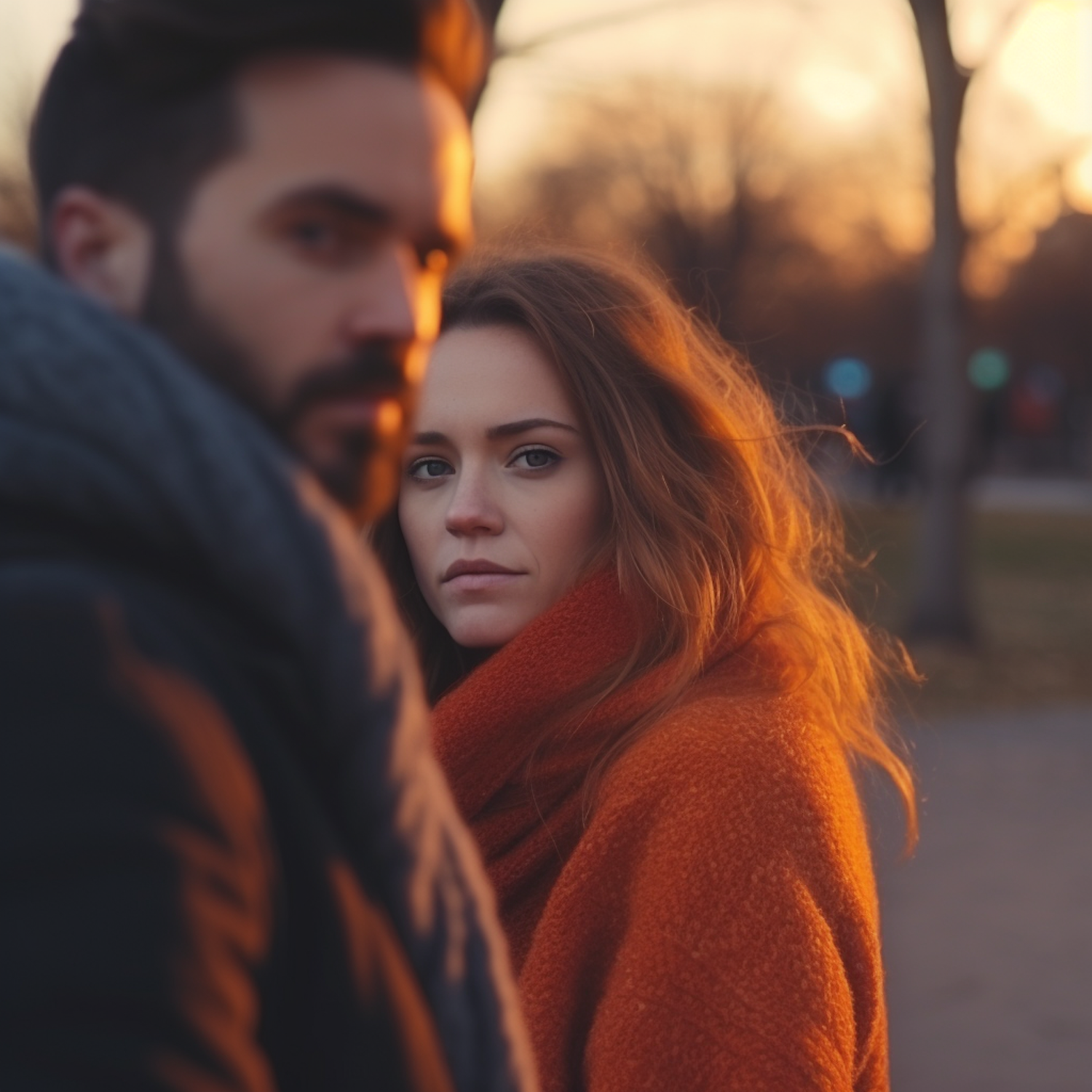 A woman in an orange coat gazes contemplatively at the camera, with a blurred man in the foreground, set against a warm sunset backdrop.