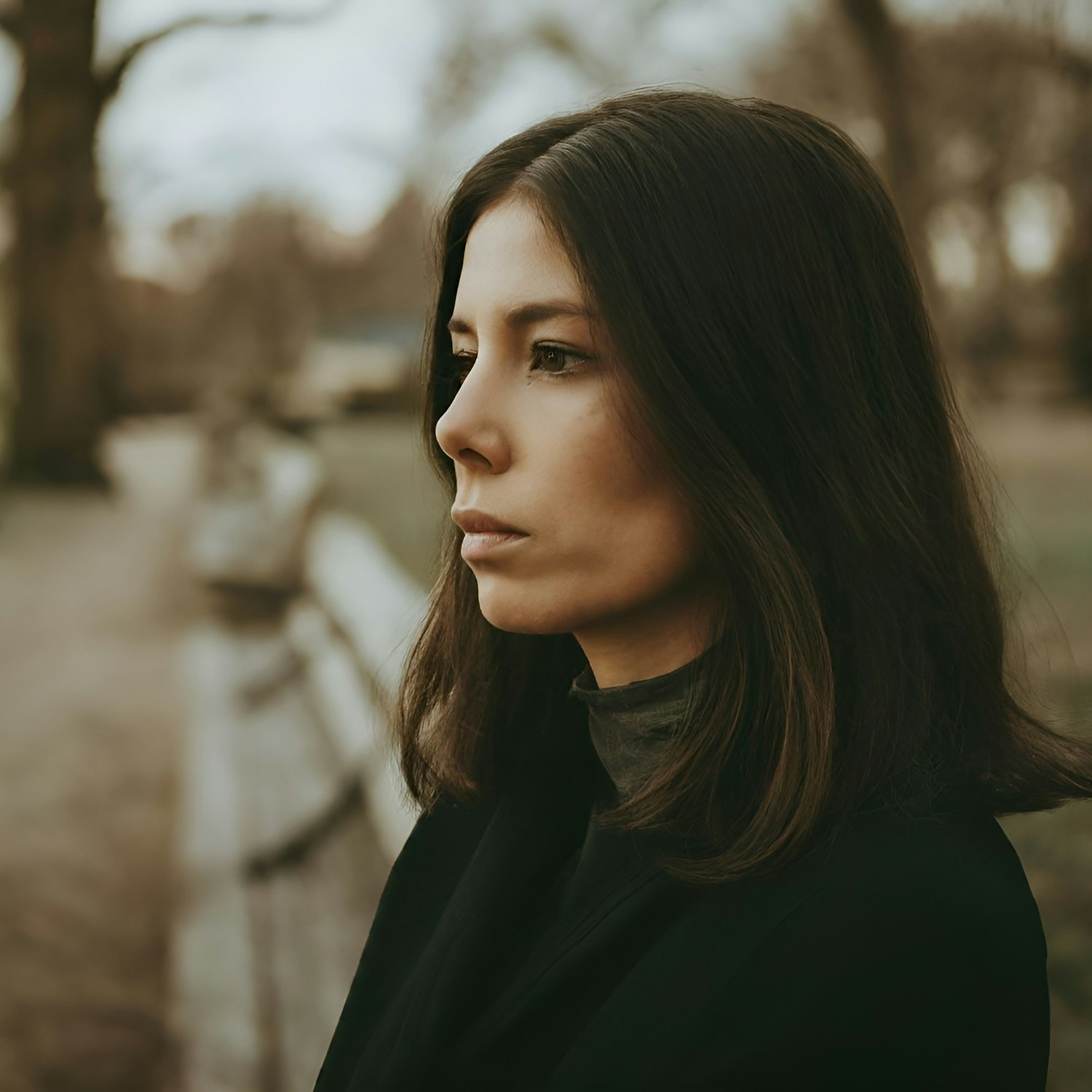 Pensive woman with dark brown hair and a serious expression outdoors, surrounded by muted tones and soft natural lighting.