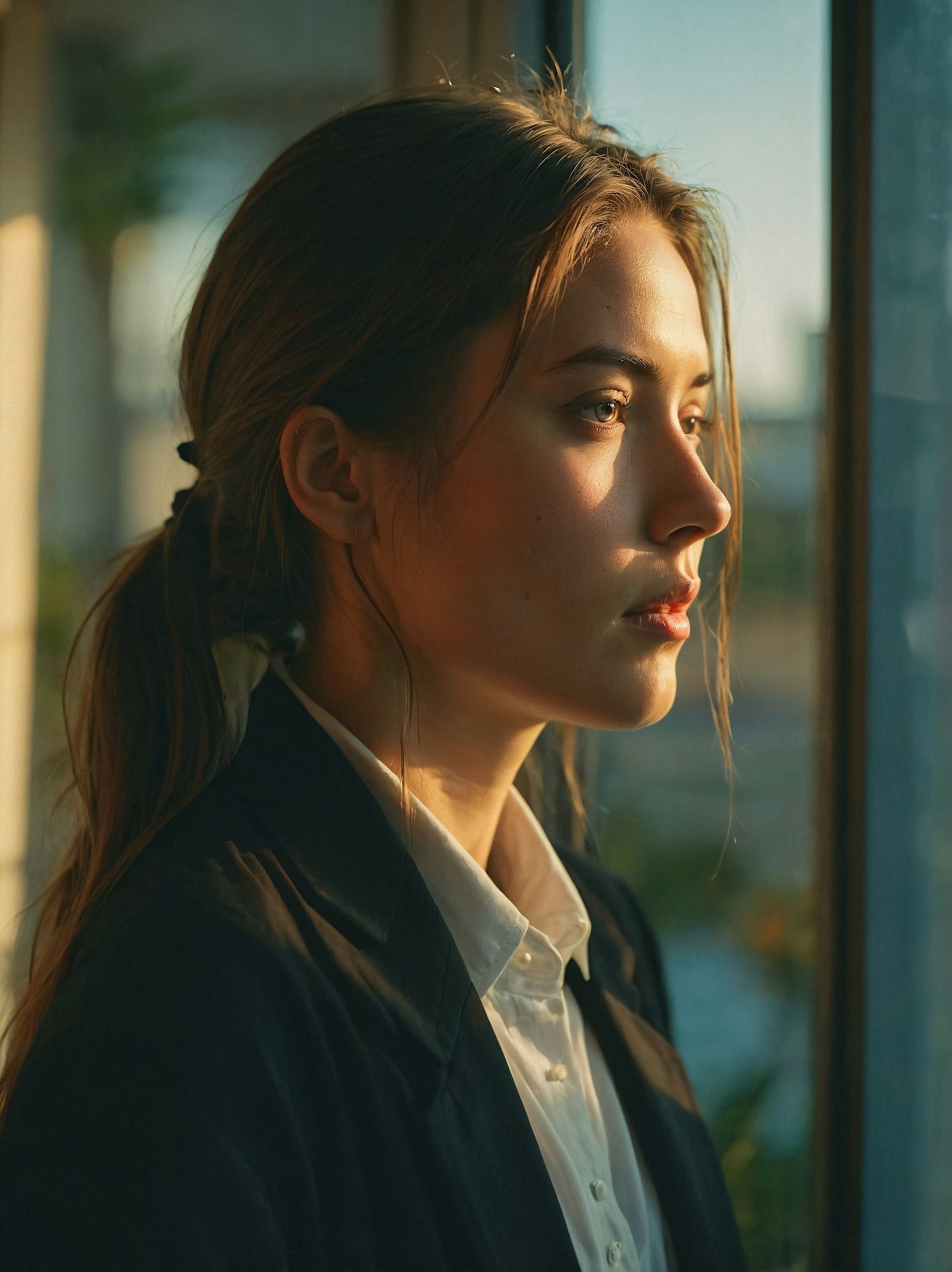 Young woman in a blazer gazes out a window, bathed in warm sunset light, creating a serene and contemplative mood.
