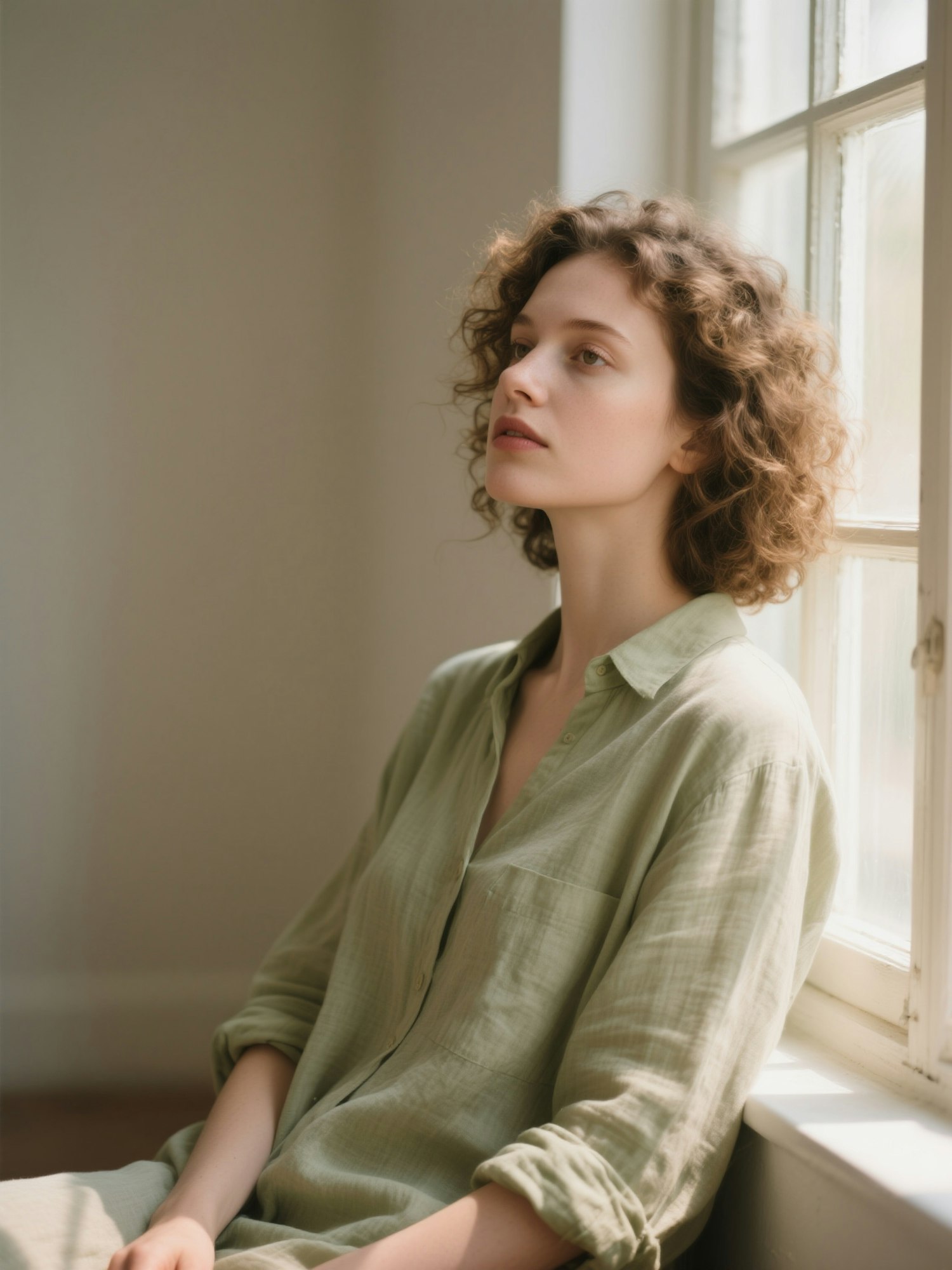 natural daylight portrait, calm and refined mood, clean background, minimal aesthetic, warm soft tones and sage or beige palette, realistic photography, elegant composition, no makeup or very natural look, soft skin texture, cinematic lighting — portrait of a woman with curly hair in a linen shirt, sitting near a softly lit window, contemplative mood