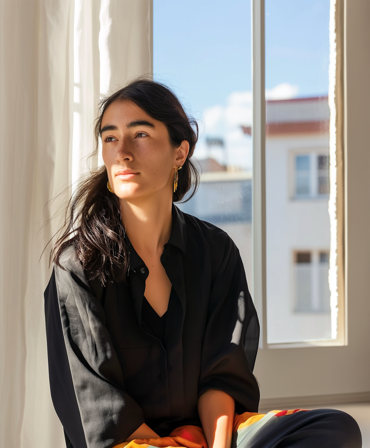 Young woman with dark hair in black shirt, sitting by a sunlit window, gazing outside with a contemplative expression.