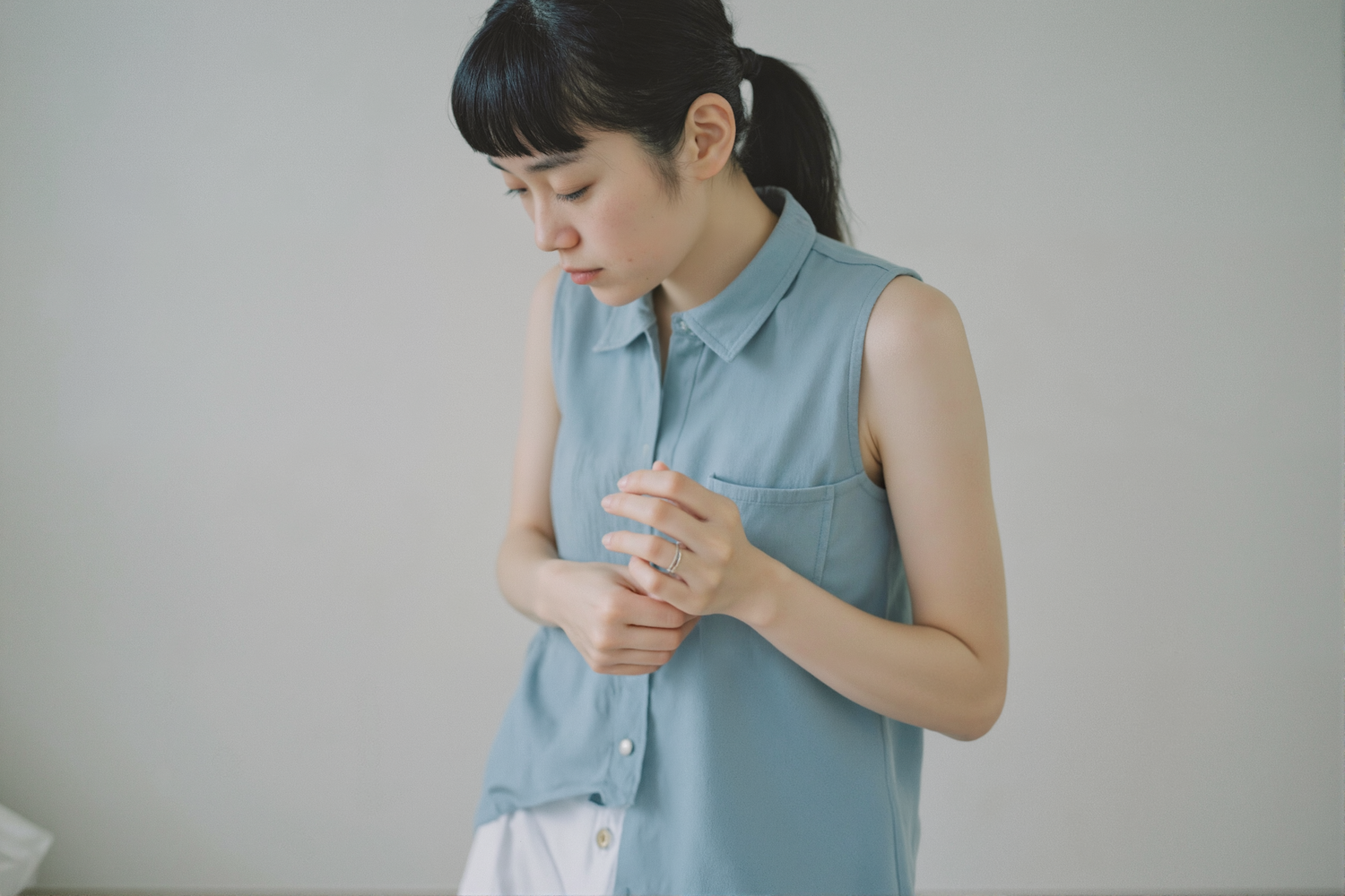 A serene portrait of a young woman in a light blue sleeveless shirt, clasping her hands in a contemplative pose against a neutral background.