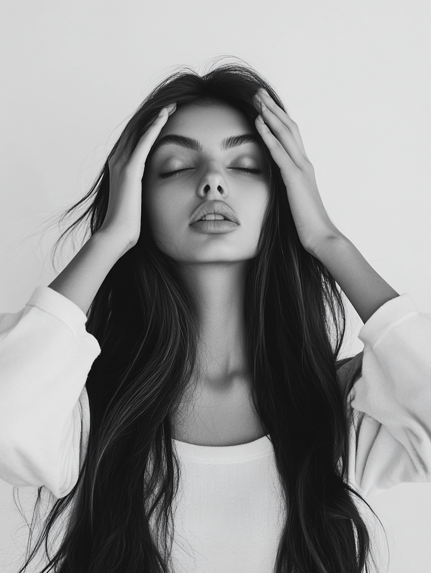 Serene woman with long dark hair and closed eyes, hands on head, in a minimalist setting. Calm and introspective mood.