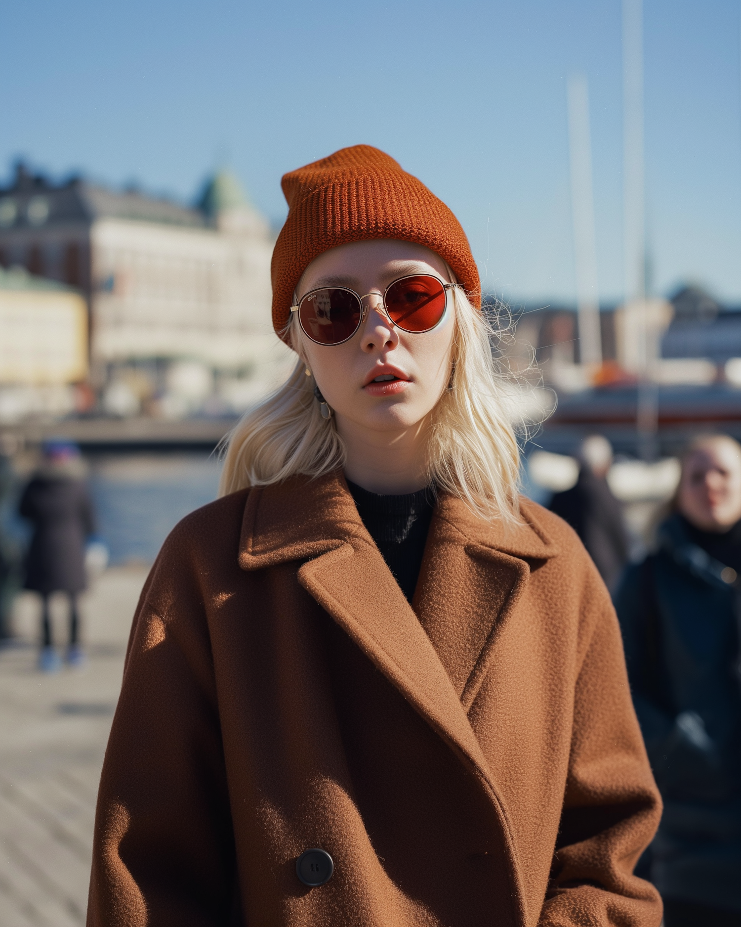 Stylish woman in a rust beanie and sunglasses, wearing a brown coat, stands in a cityscape with a clear blue sky.