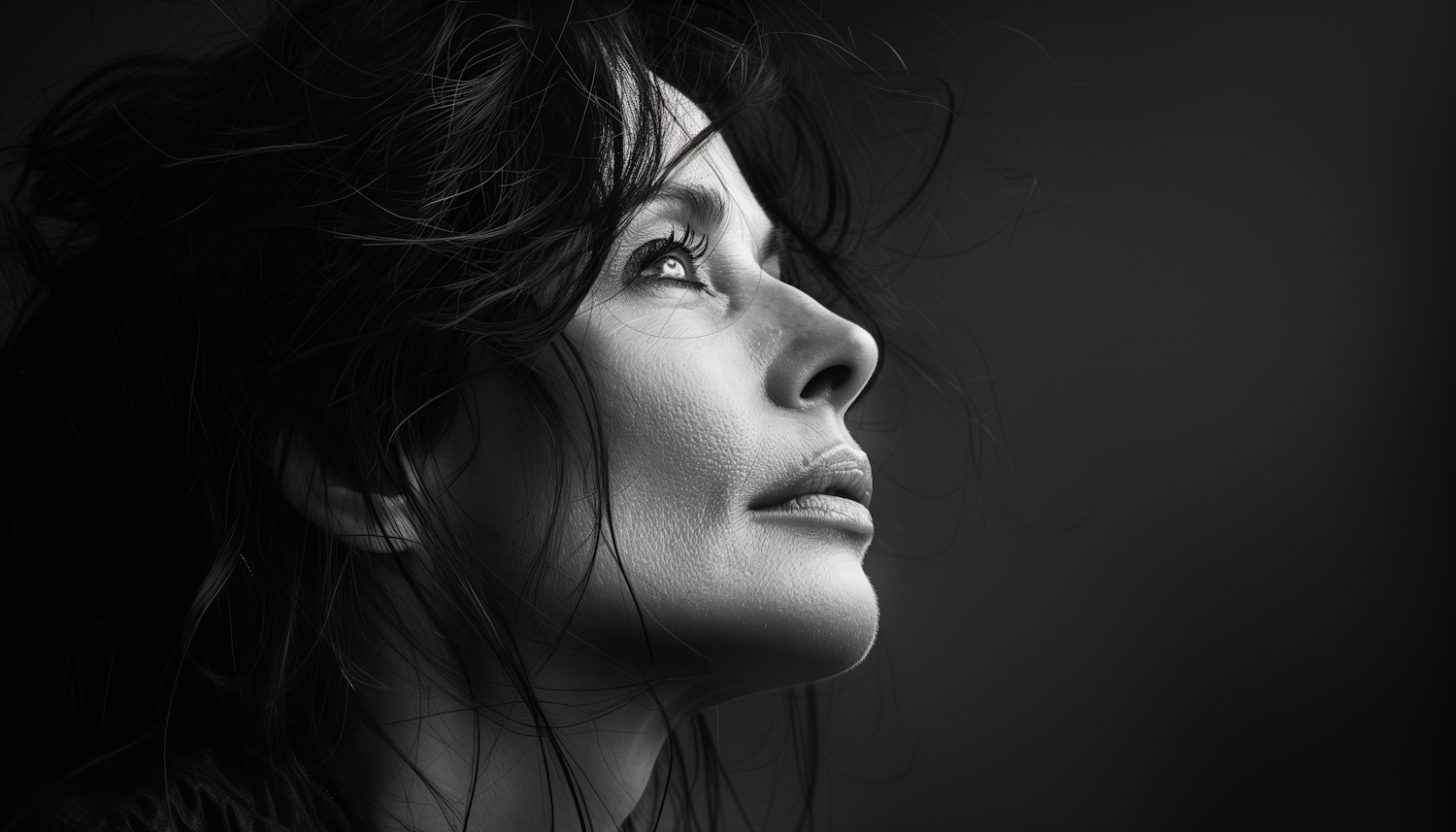 Black and white portrait of a woman gazing upwards, with textured skin and tousled hair, set against a dark background.