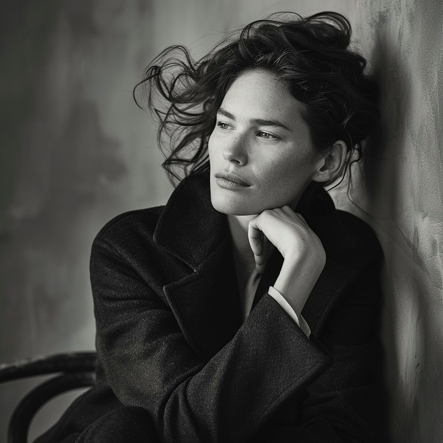 Black and white portrait of a woman with wavy hair, wearing a dark coat, looking contemplatively to the side.