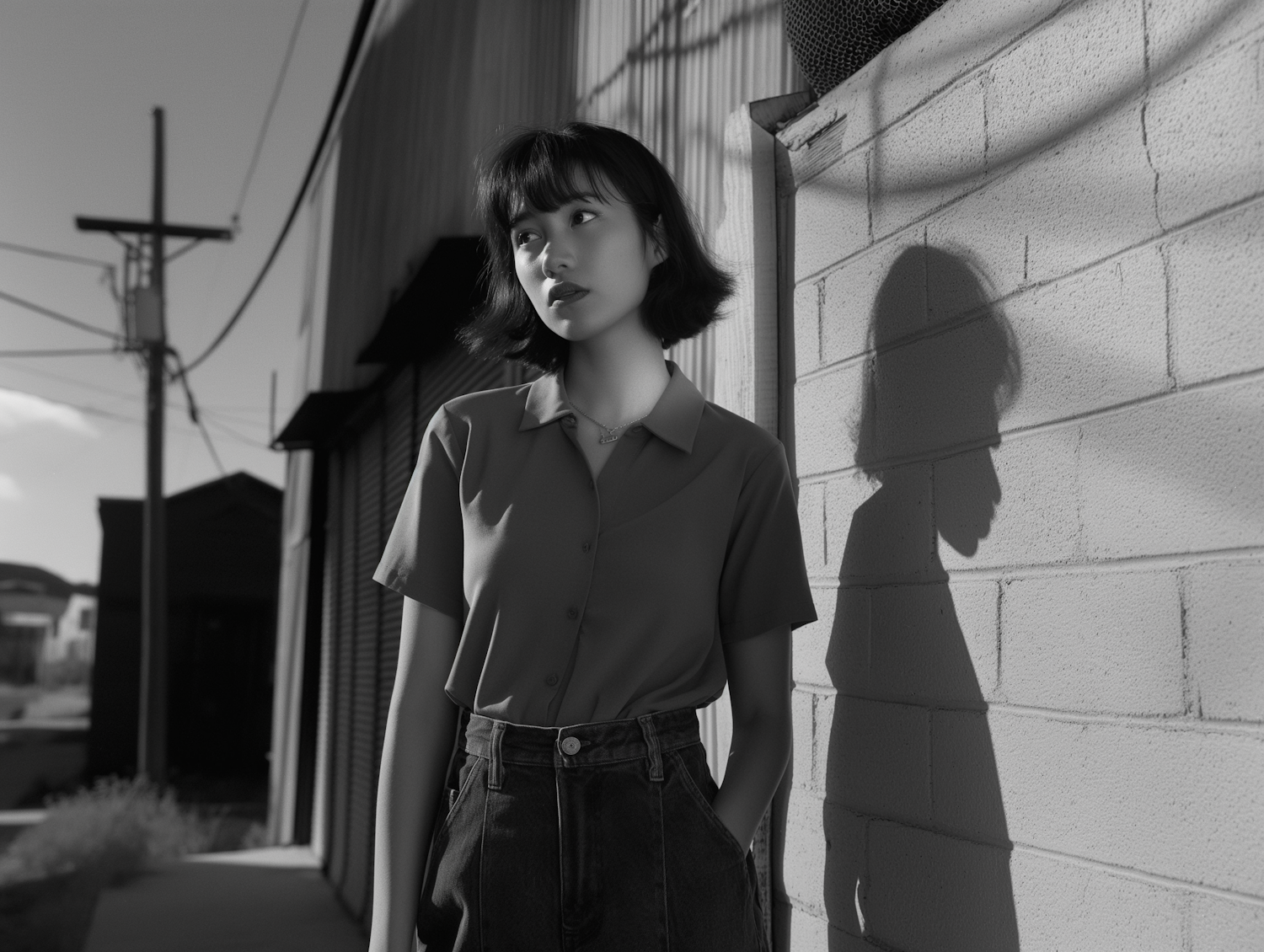 Black and white photo of a young woman in an industrial setting, casting a shadow on a brick wall. Dramatic and contemplative mood.