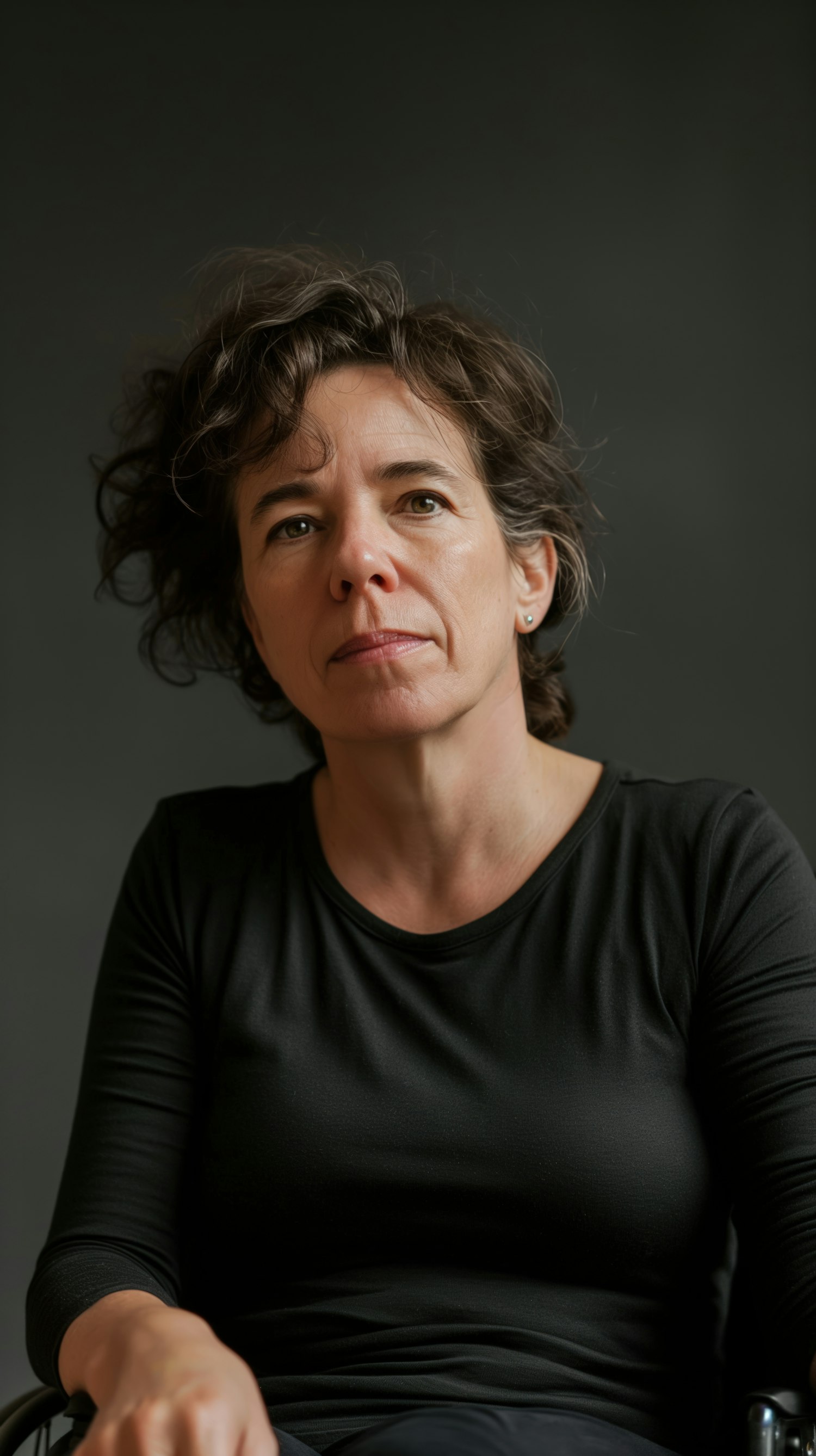 Portrait of a contemplative woman with short curly hair in a black top against a dark background.