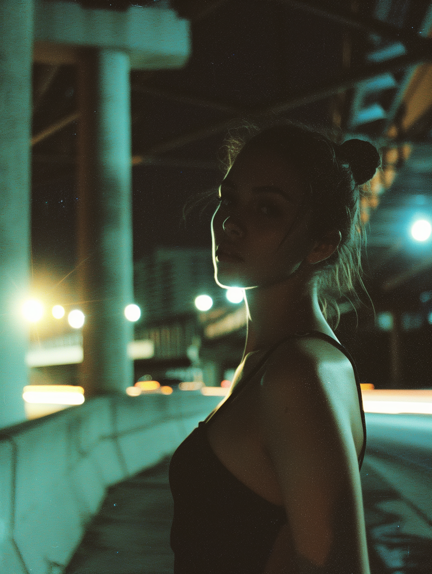 Moody urban portrait of a woman in silhouette under streetlights, with a greenish hue and blurred city lights in the background.