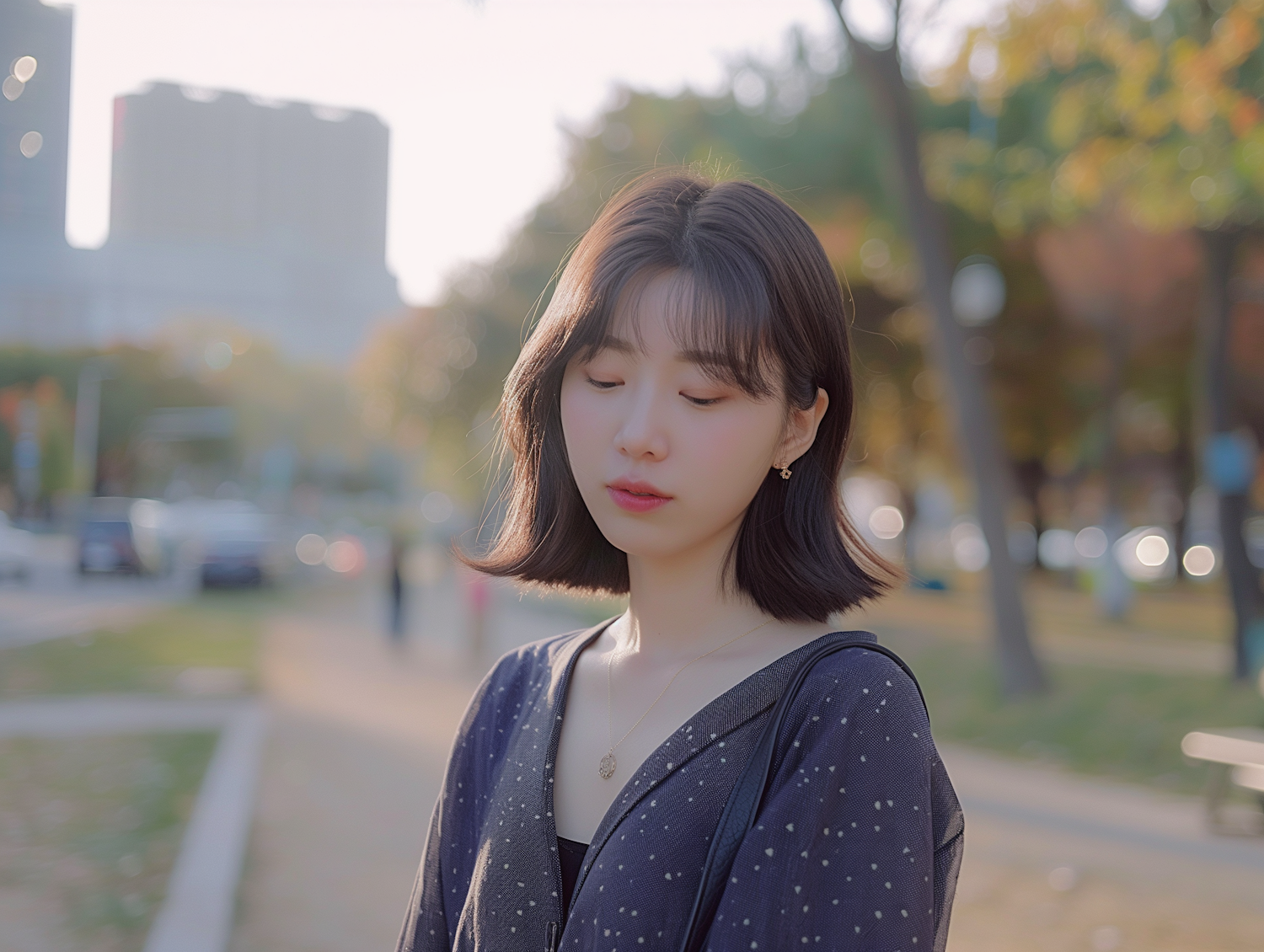 Young woman with short dark hair in a park, wearing a polka-dotted blouse and gold jewelry, with autumn trees and cityscape in the background.