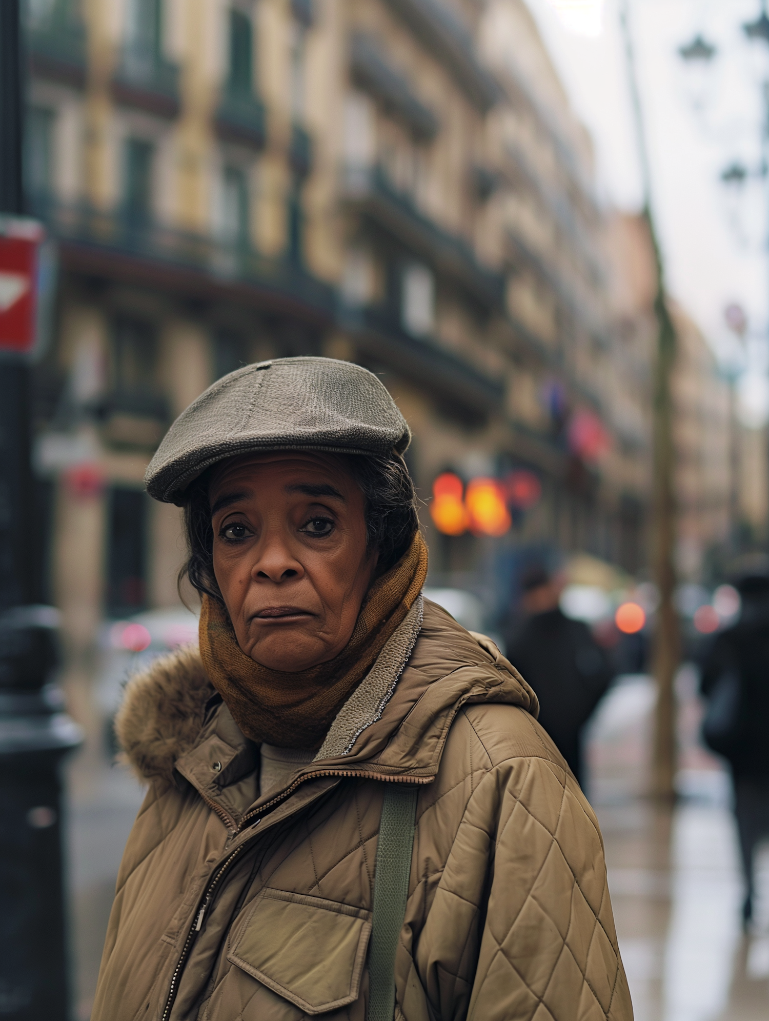 Middle-aged woman in a beige quilted jacket and gray cap, standing in a busy urban street with a contemplative expression.