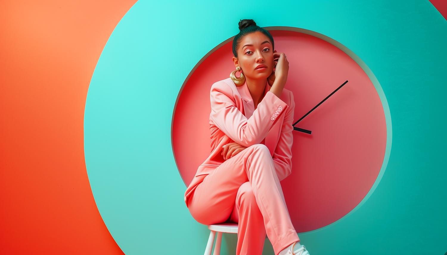 Woman in pink suit with gold earrings sits against a colorful clock backdrop, blending vibrant turquoise and orange hues.