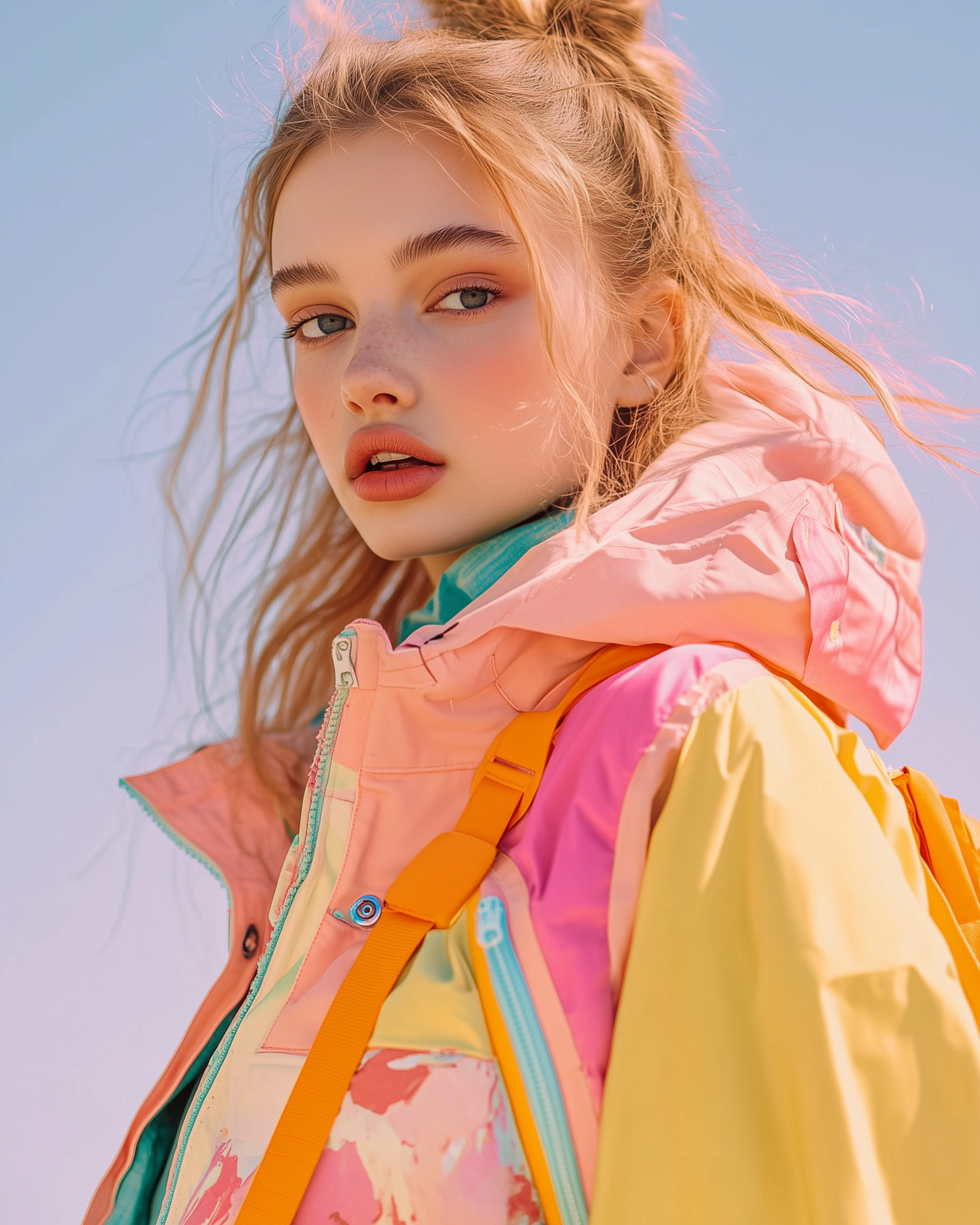 Young woman in colorful pastel windbreaker against a clear blue sky, exuding confidence and style with her striking blue eyes and blonde hair.