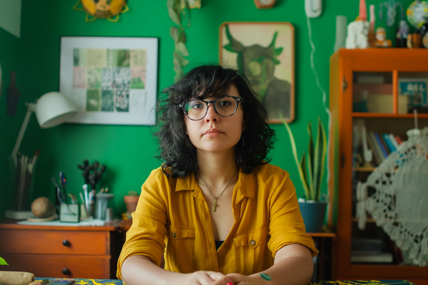 Woman with black hair and glasses in a mustard shirt, sitting in a green-walled room with plants and art. Cozy and artistic vibe.
