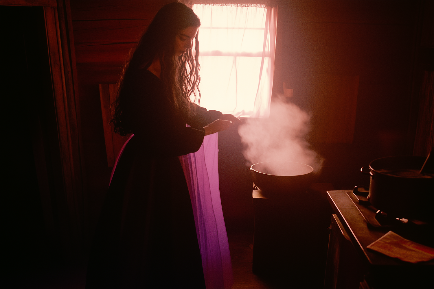 A woman in a dark dress with purple fabric stands by a steaming pot in a warmly lit, rustic room.