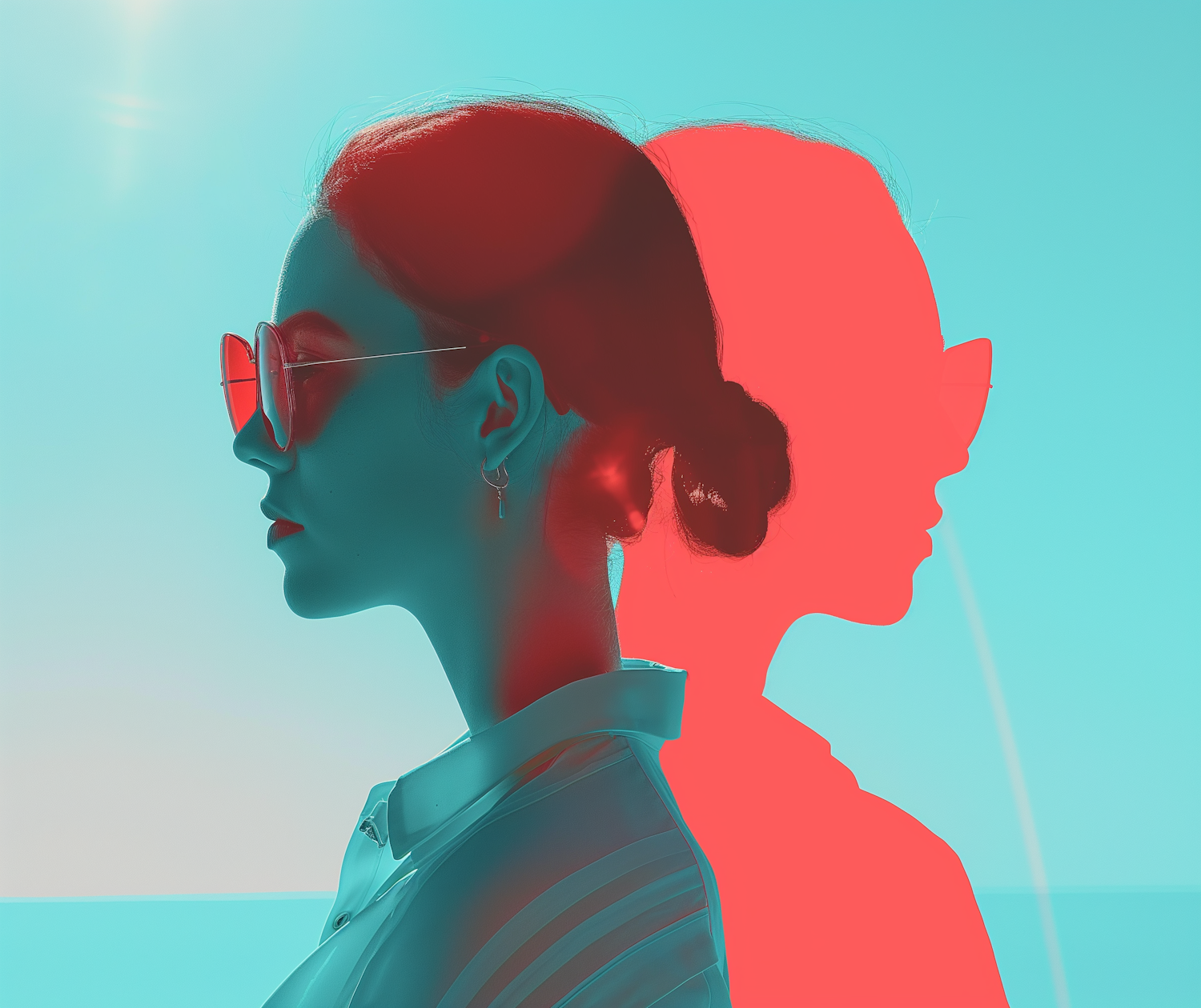 Artistic profile of a woman with sunglasses, featuring a red silhouette overlay on a turquoise background, creating a modern, surreal effect.