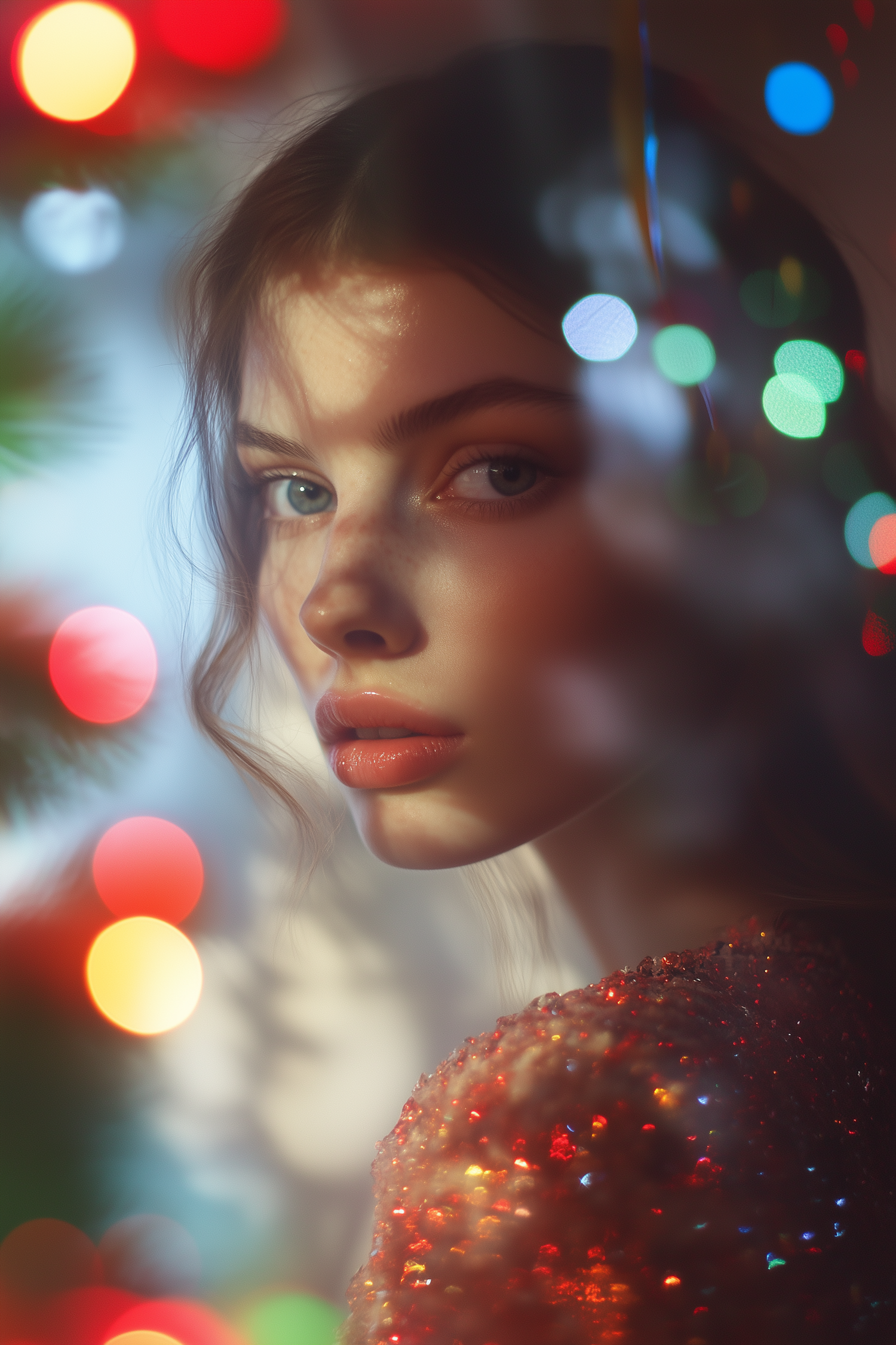 Portrait of a young woman with blue eyes, soft waves, and a sequined top, surrounded by festive bokeh lights in a dreamy setting.