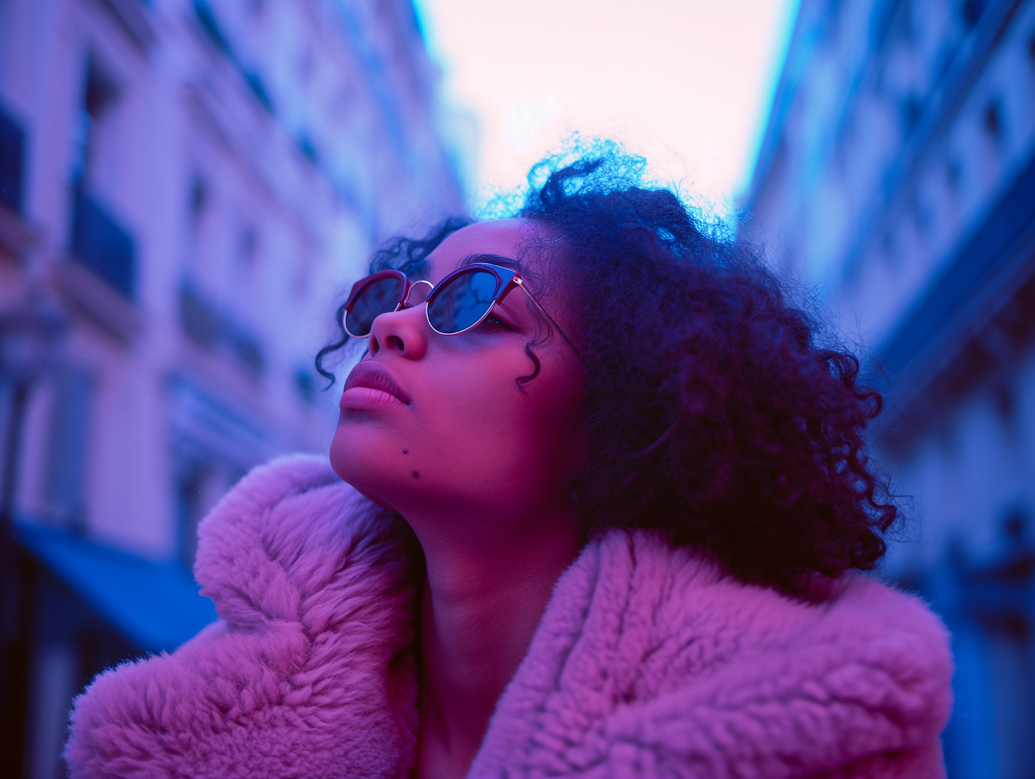 Stylish woman in pink fur coat and sunglasses, gazing upwards in a vibrant pink and blue cityscape.