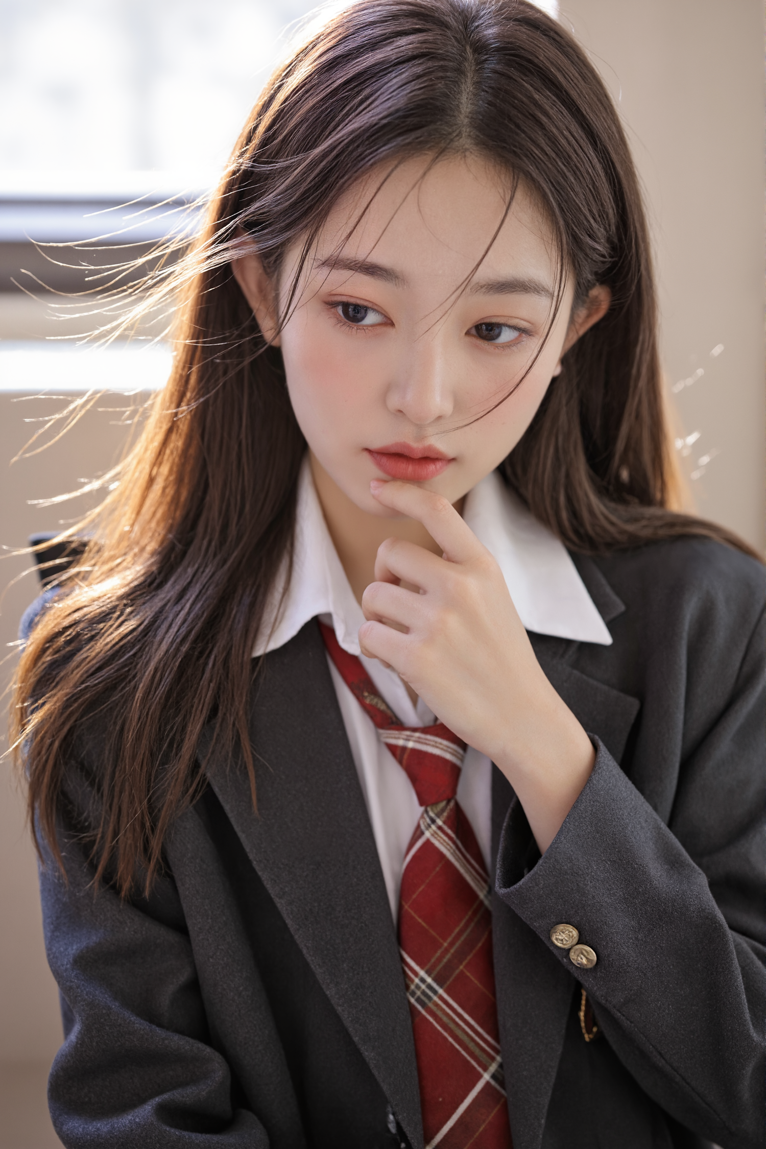 Thoughtful Asian woman in a blazer and plaid tie, gazing sideways with a contemplative expression. Soft lighting highlights her features.