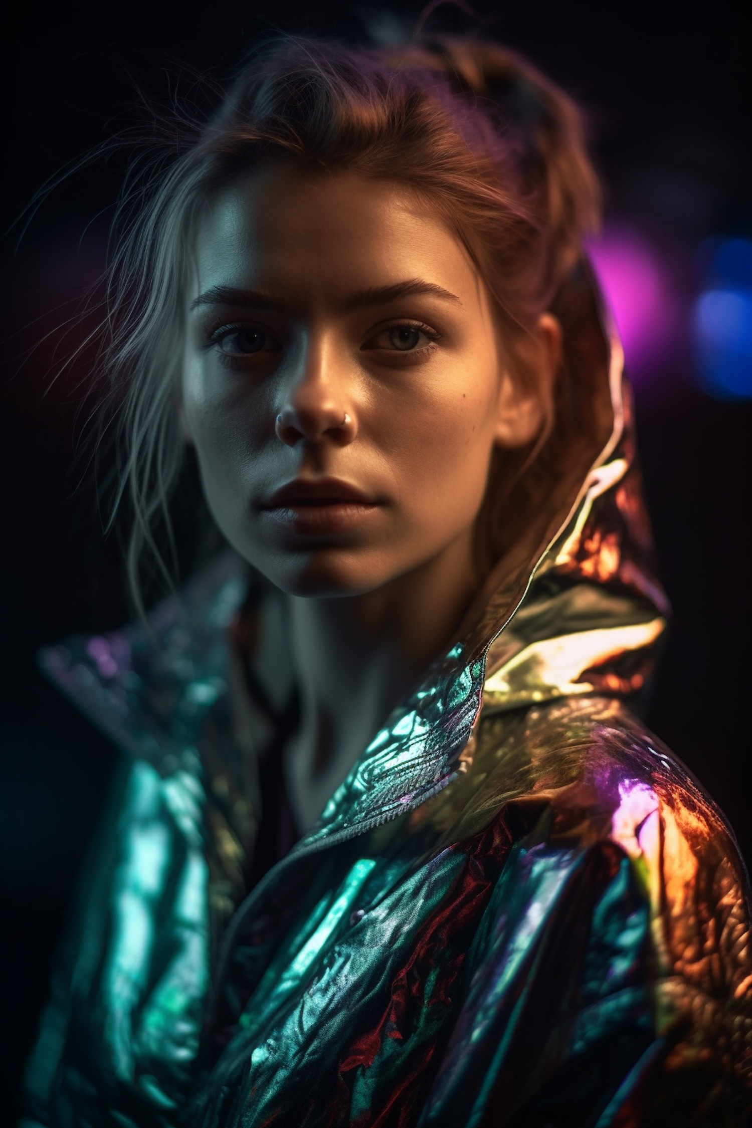 Close-up portrait of a woman in a shiny iridescent jacket with colorful lights in the background, creating a modern and vibrant look.