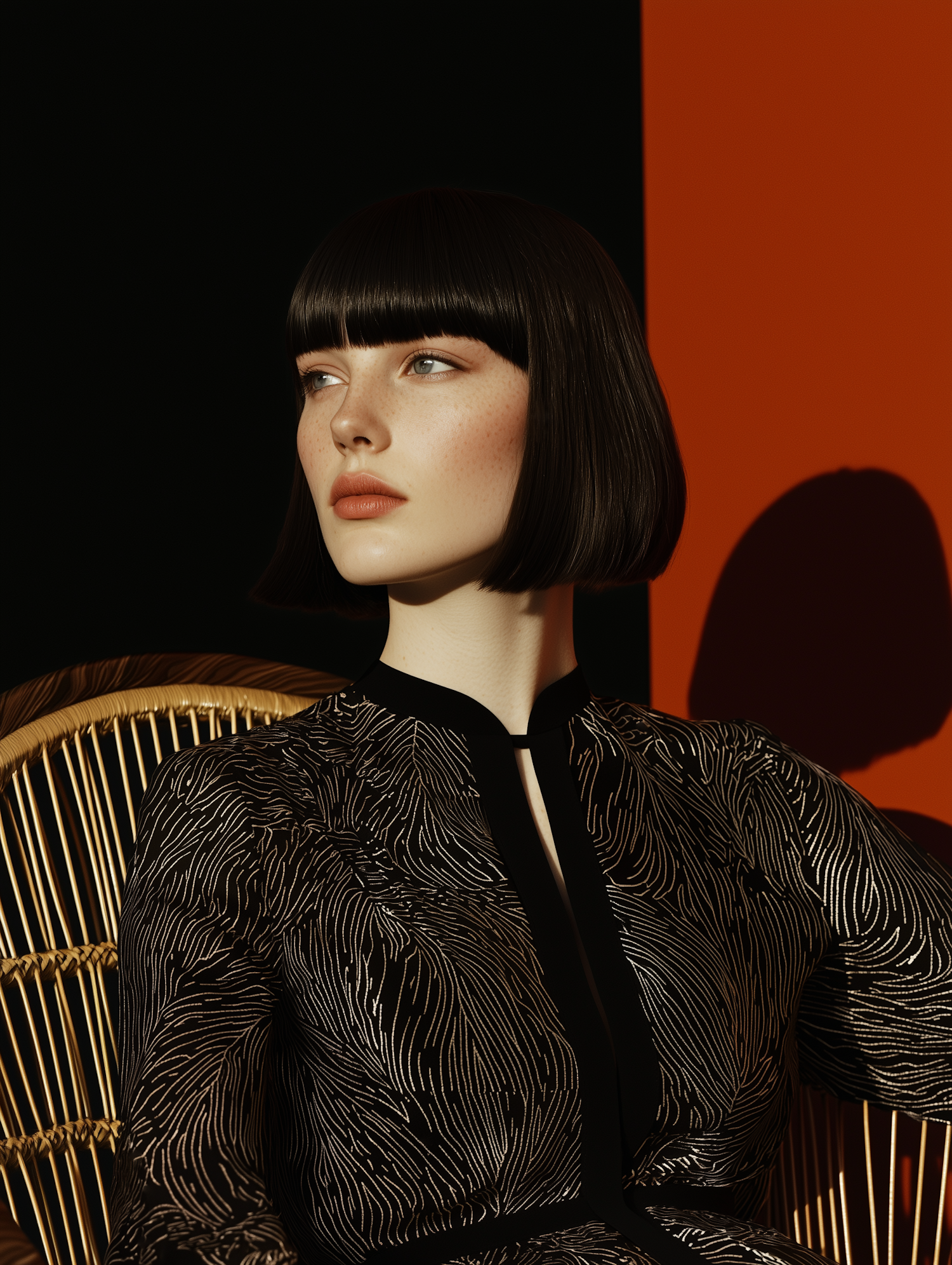 Elegant woman with sleek bob hairstyle in a patterned dress, set against a bold black and orange background.