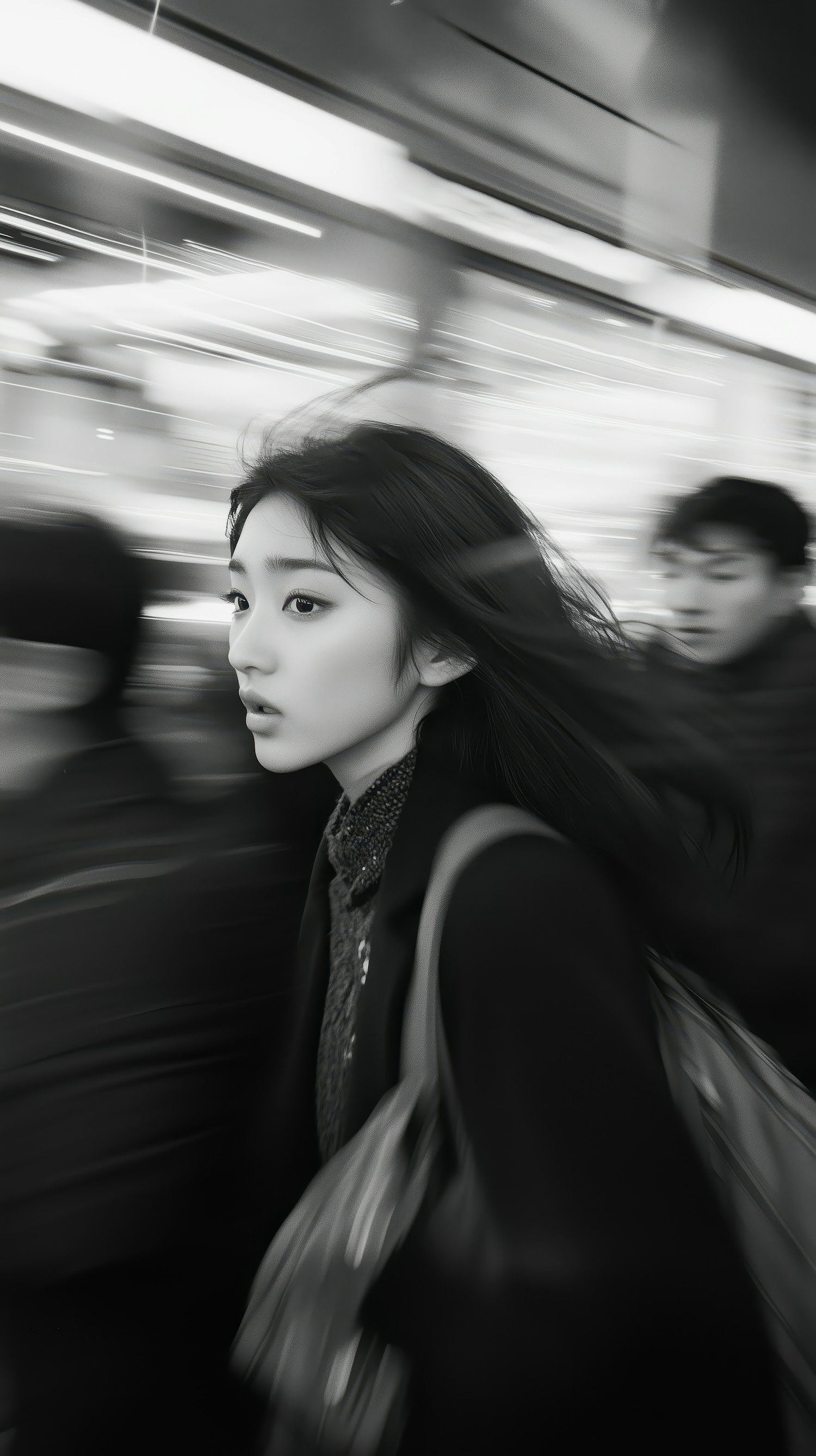 Dynamic black and white photo of a young woman in motion, capturing urban energy and movement with a blurred background.