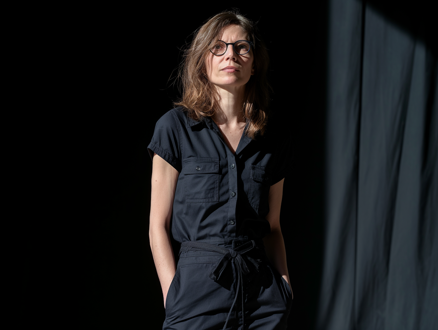 Caucasian woman in a dark jumpsuit with glasses, standing against a shadowy background, exuding confidence and contemplation.