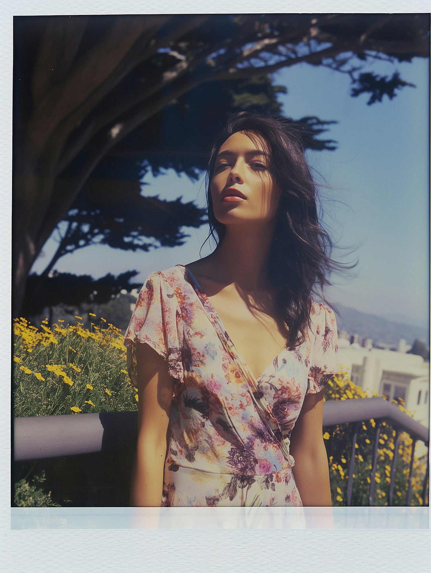 Woman in floral dress basks in sunlight, surrounded by yellow flowers and a clear blue sky.