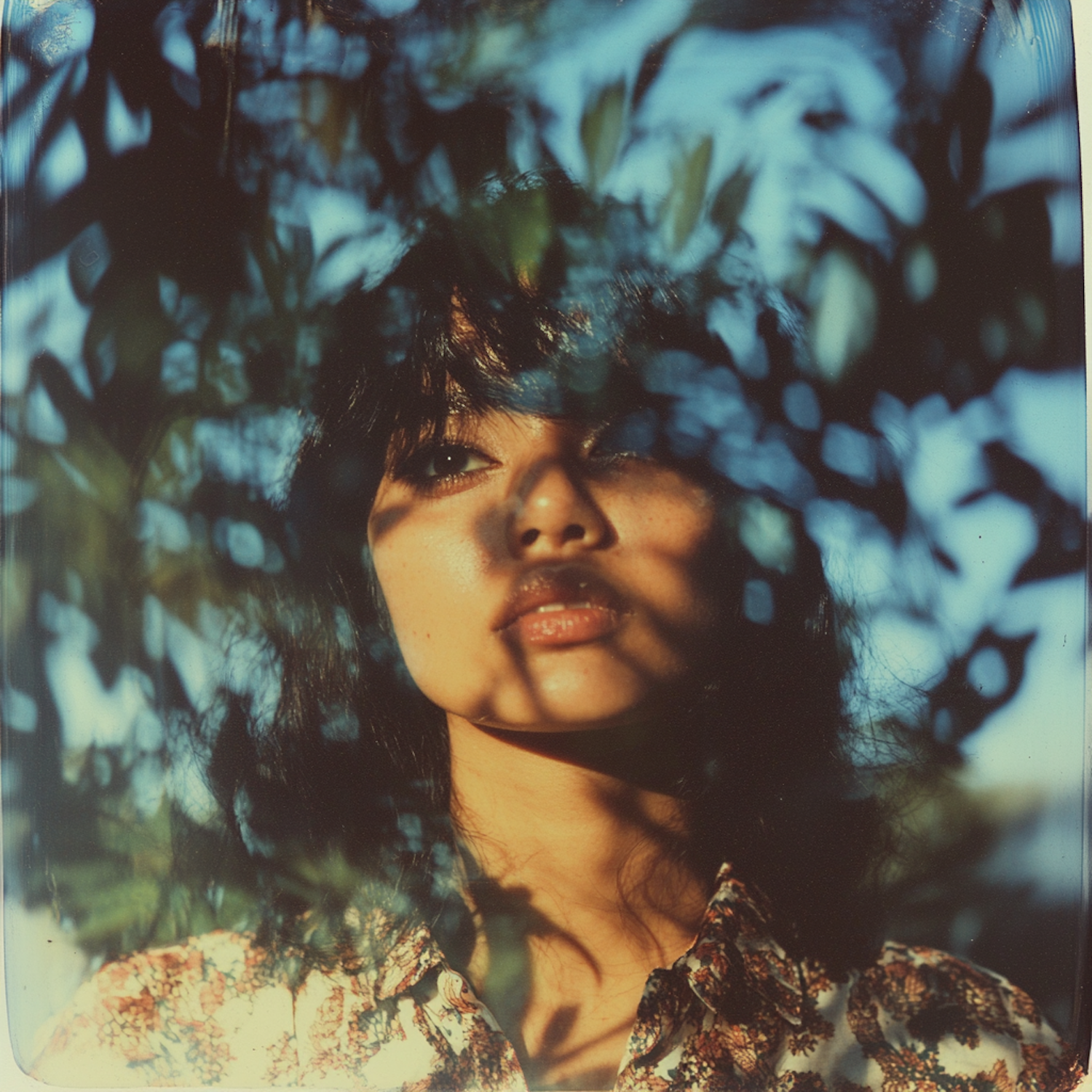 A young woman gazes through leaves, sunlight casting shadows on her face, creating a serene and contemplative scene.
