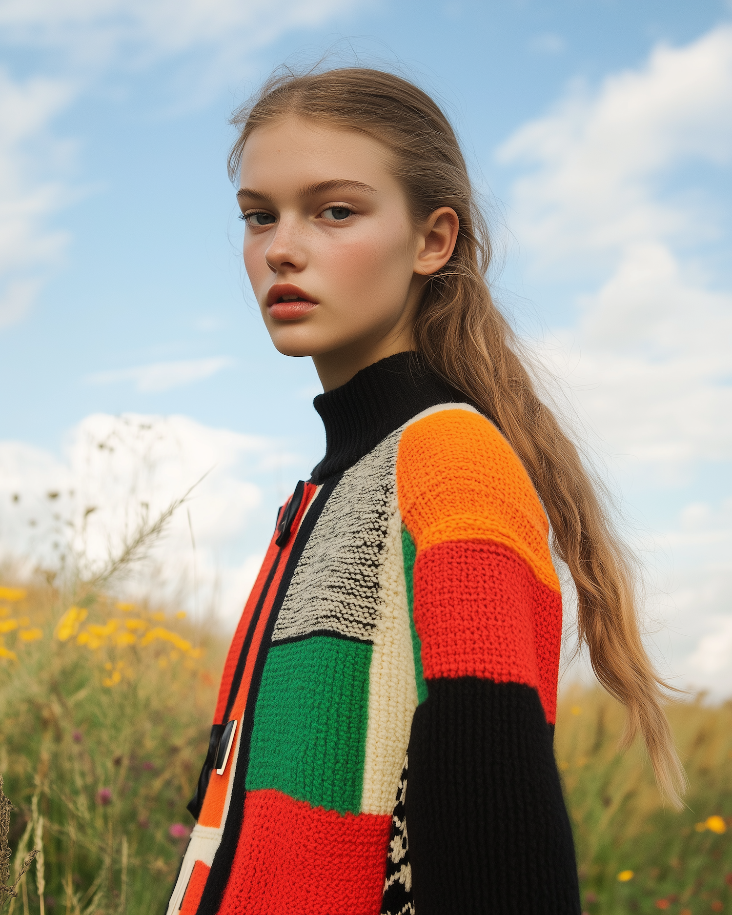 Young woman in a colorful patchwork sweater stands in a field, under a bright blue sky, with a calm expression and wavy blonde hair.