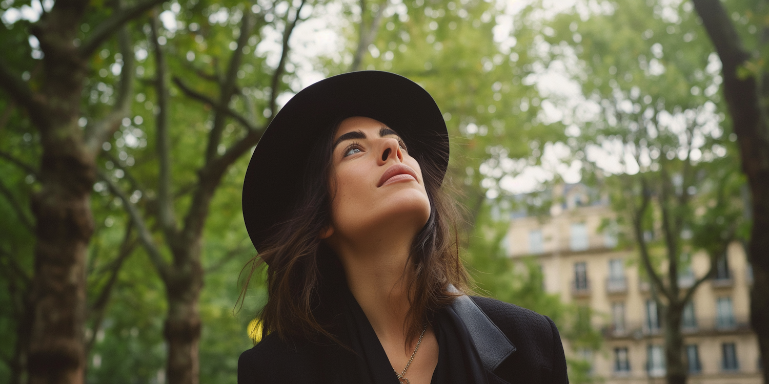 Woman in a black hat gazes upward in a lush park, surrounded by trees and soft light, creating a serene and contemplative scene.