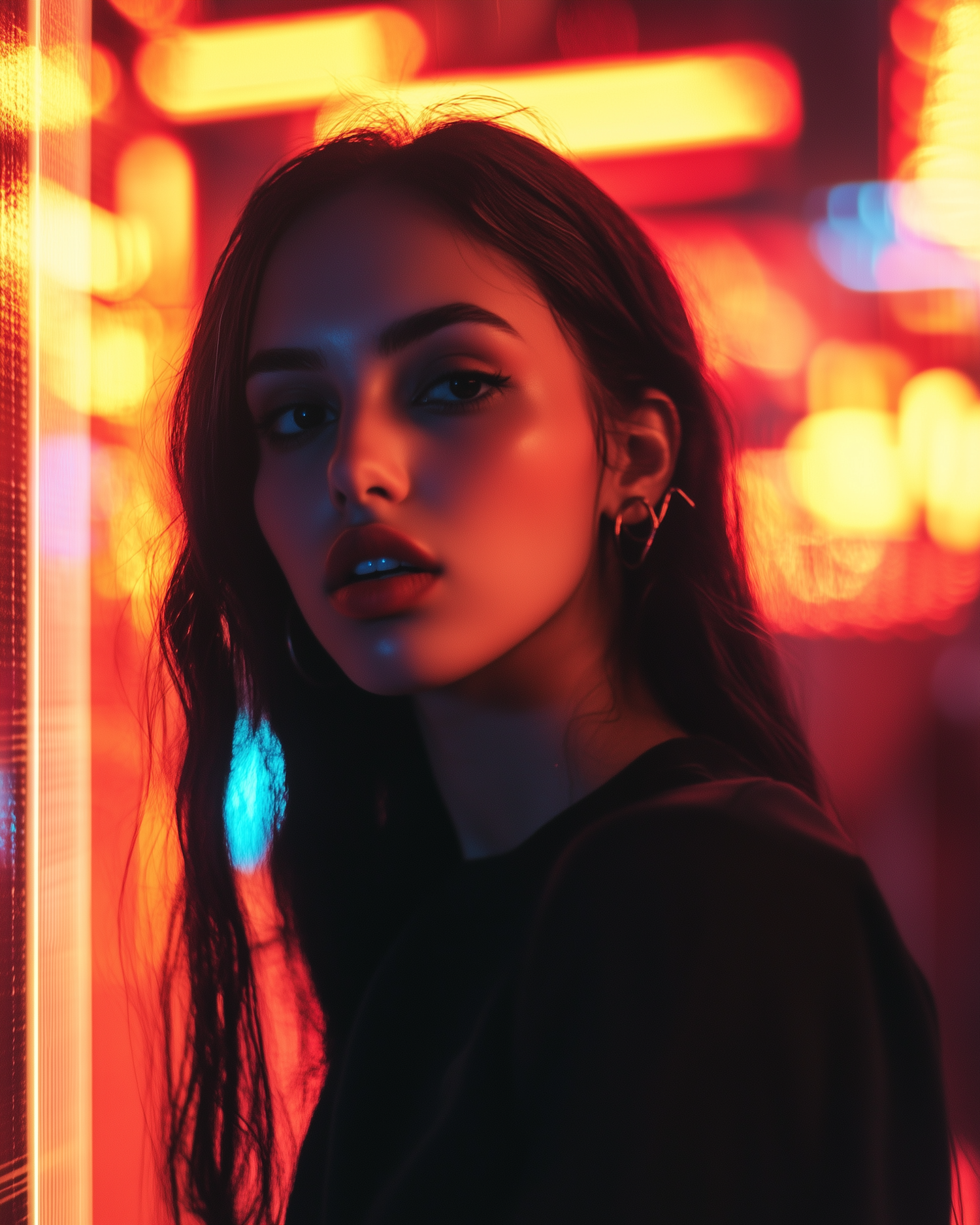 Moody portrait of a young woman with neon lights in the background, creating a cinematic urban atmosphere.