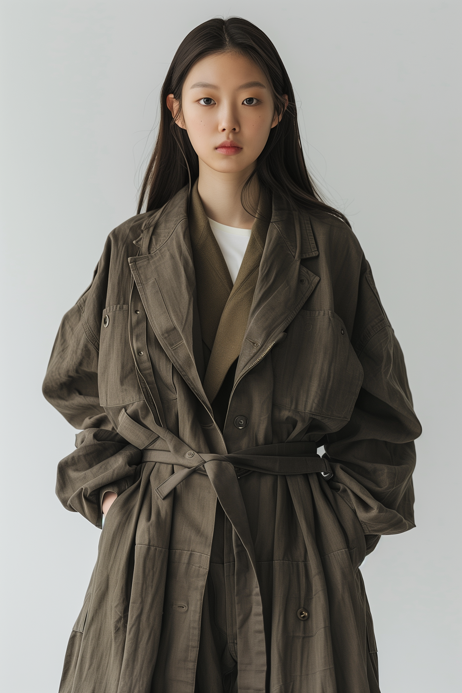 Asian woman in an olive-green trench coat, long black hair, calm expression, light gray background.