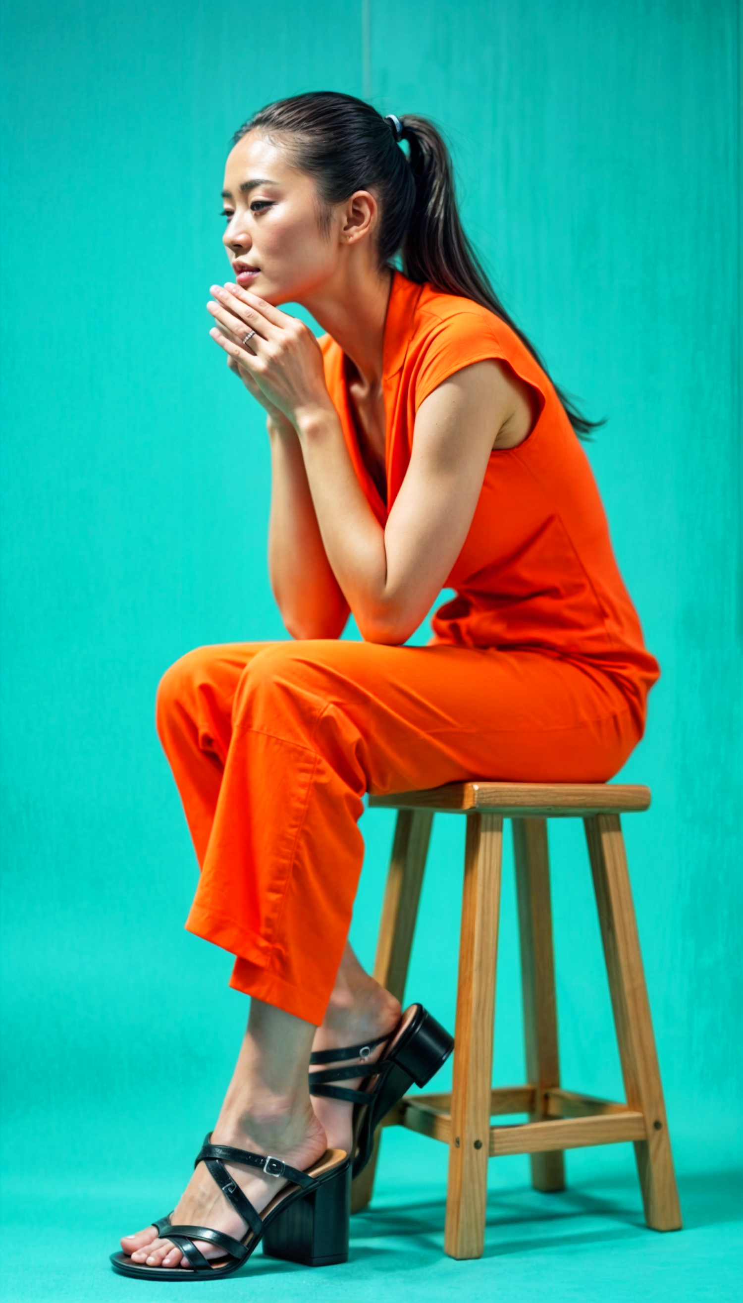 Asian woman in orange jumpsuit sits thoughtfully on a stool against a turquoise background, exuding modern style and elegance.
