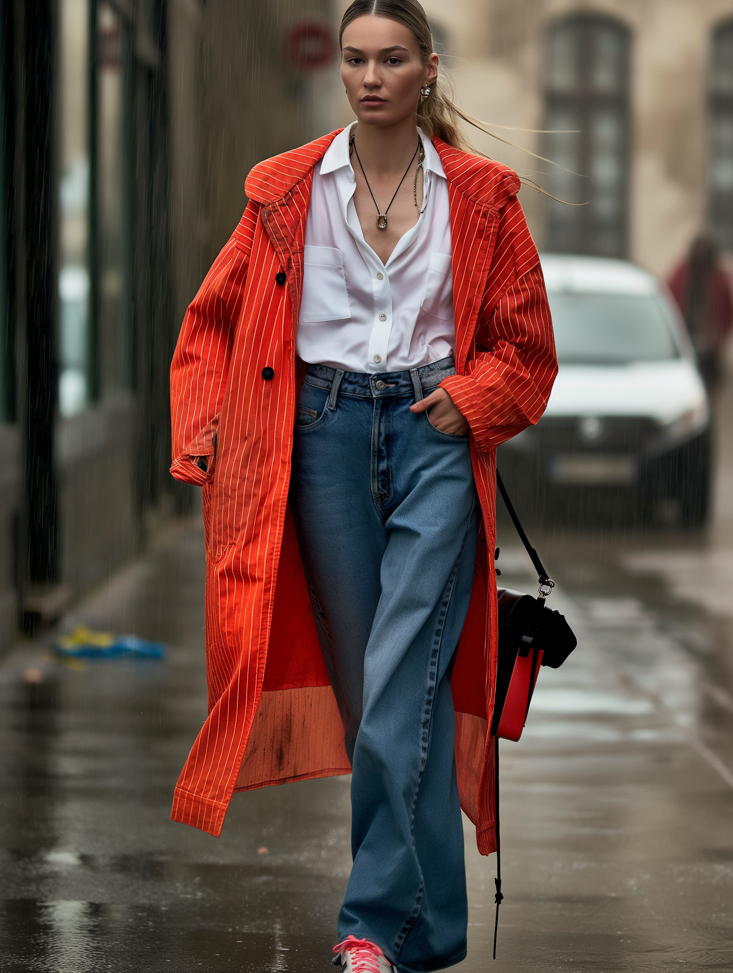 Stylish woman in orange coat and jeans walks confidently on a rainy street, exuding modern urban fashion.