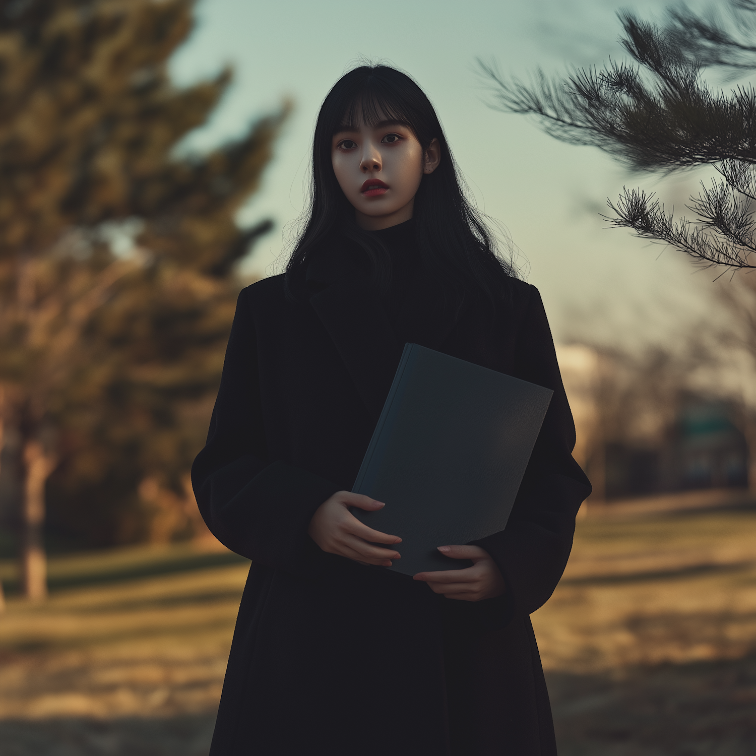 Young woman in black coat holding a folder in a serene park during golden hour, exuding a calm and professional vibe.