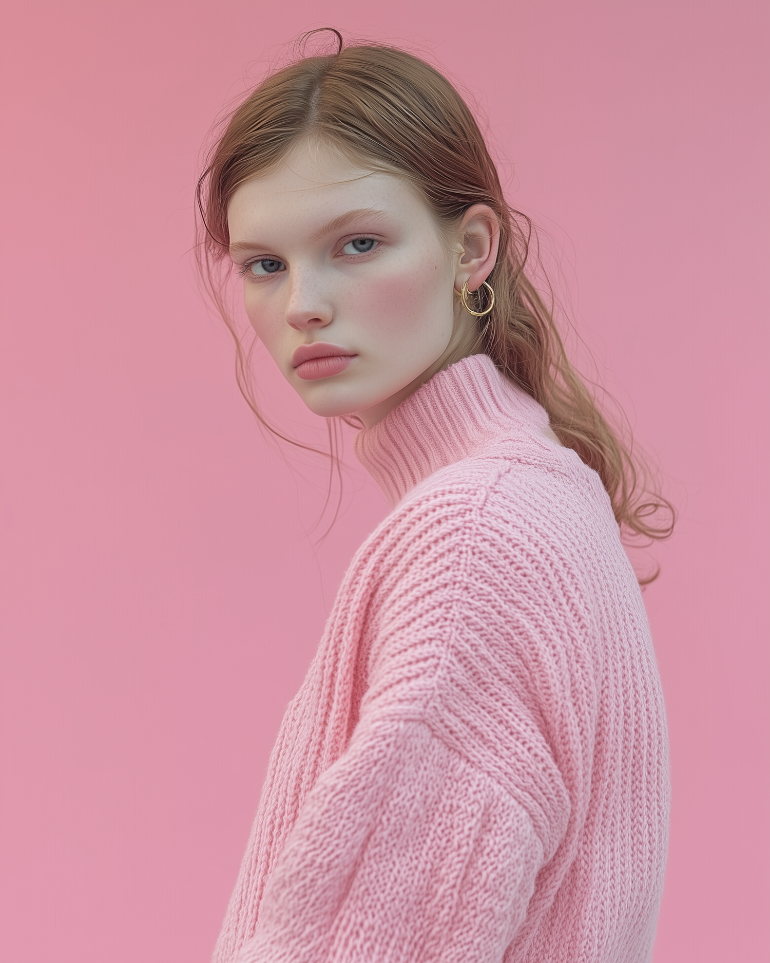 Young woman in a pink sweater against a pastel pink background, exuding elegance with gold hoop earrings and a calm expression.