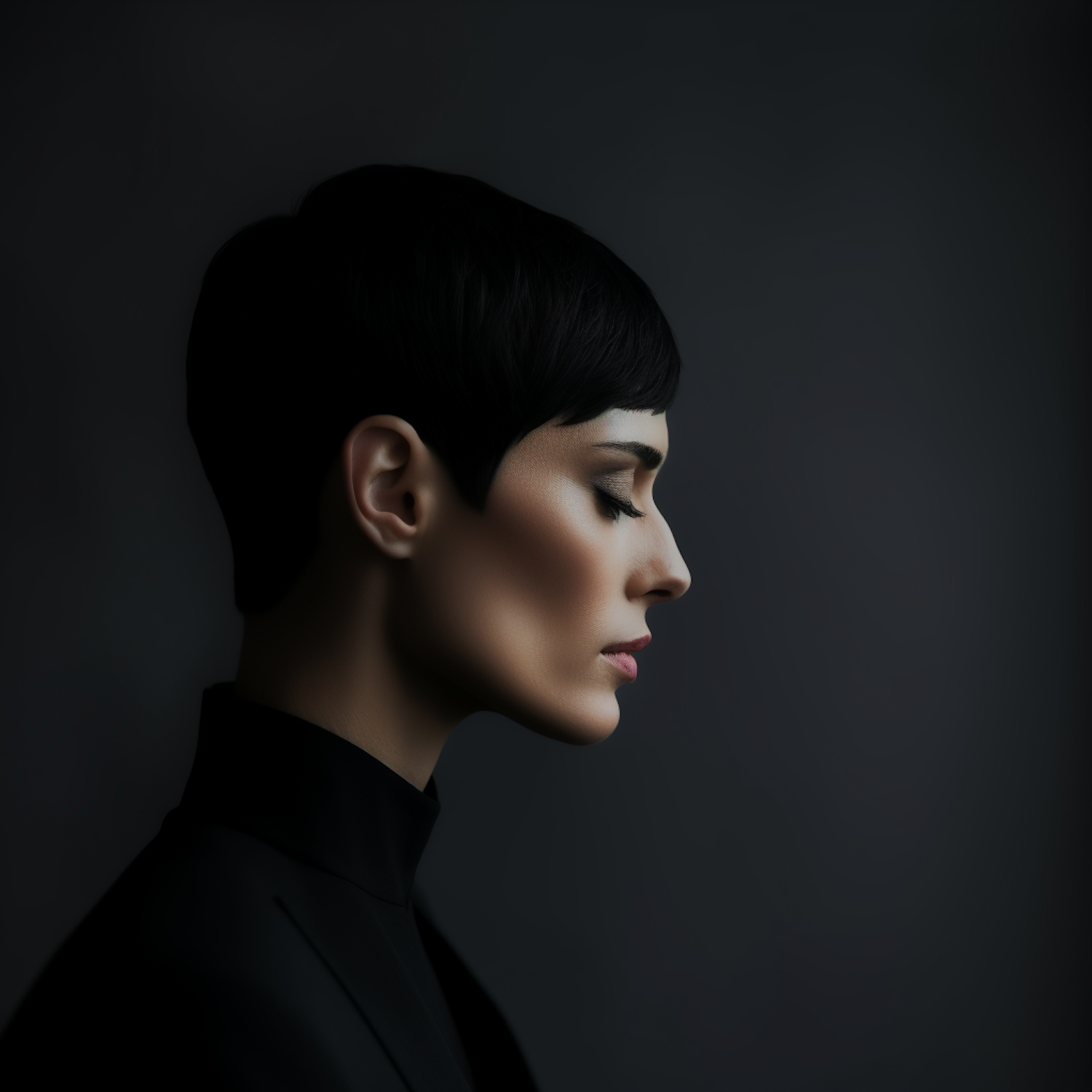 Elegant profile portrait with serene expression, short dark hair, and minimalist style against a dark background.