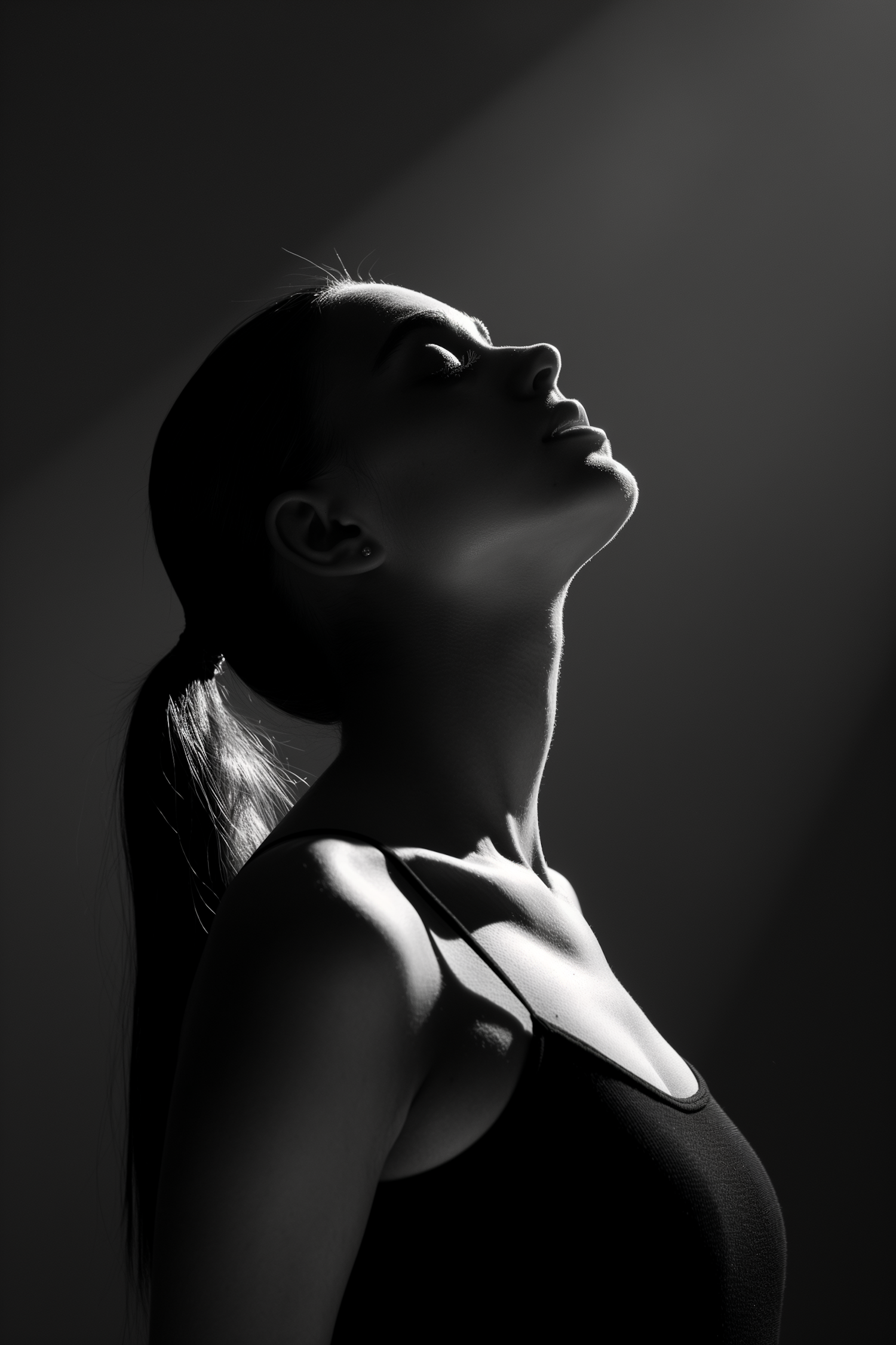 Dramatic black-and-white portrait of a woman in profile, with sleek hair and striking lighting highlighting her features.