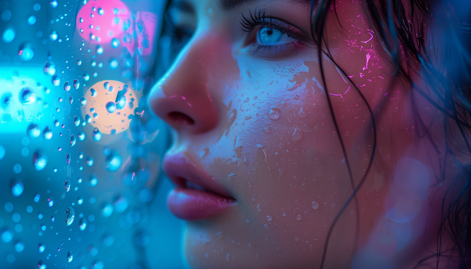Close-up of a woman's face with blue eyes and wet skin, illuminated by blue and pink lights, with raindrops on glass and bokeh lights.
