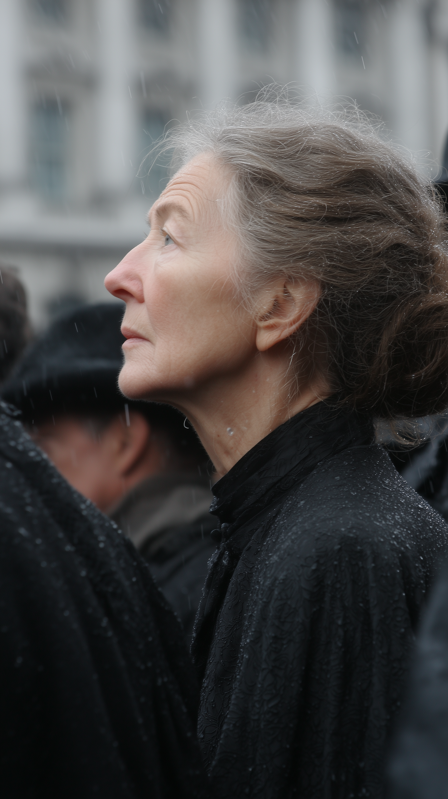 A contemplative woman in black attire stands in the rain, her profile highlighted against a blurred urban backdrop.