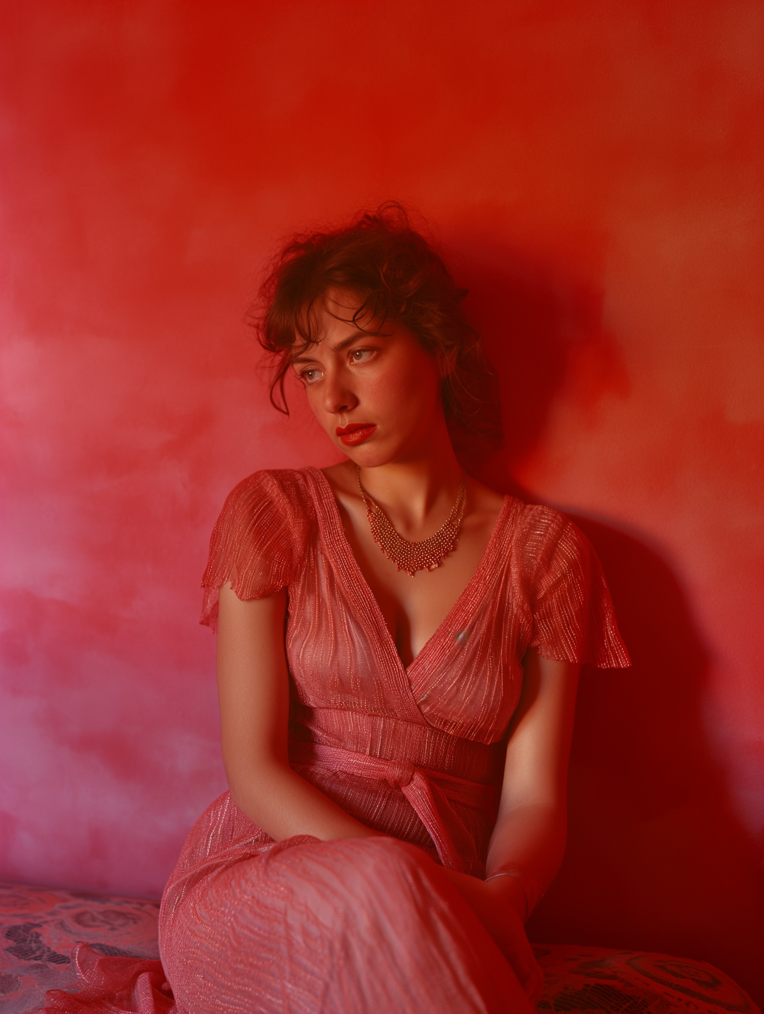 A woman in a shimmering red dress sits against a red wall, exuding elegance and introspection in a warm, monochromatic setting.
