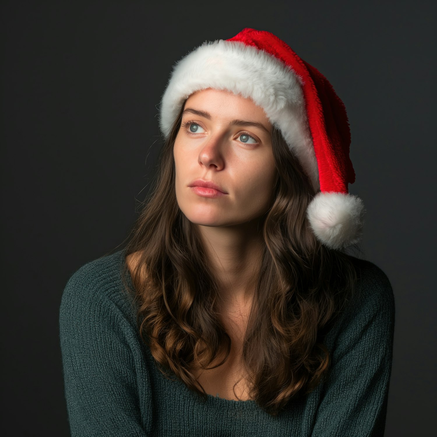 Thoughtful woman in a Santa hat, wearing a green sweater against a dark background, exuding a festive yet contemplative vibe.
