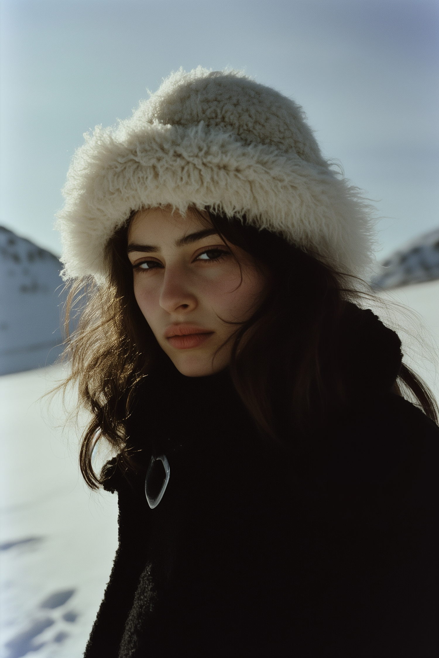 Portrait of a woman in a snowy landscape wearing a cream fluffy hat and black coat, with serene mountains in the background.