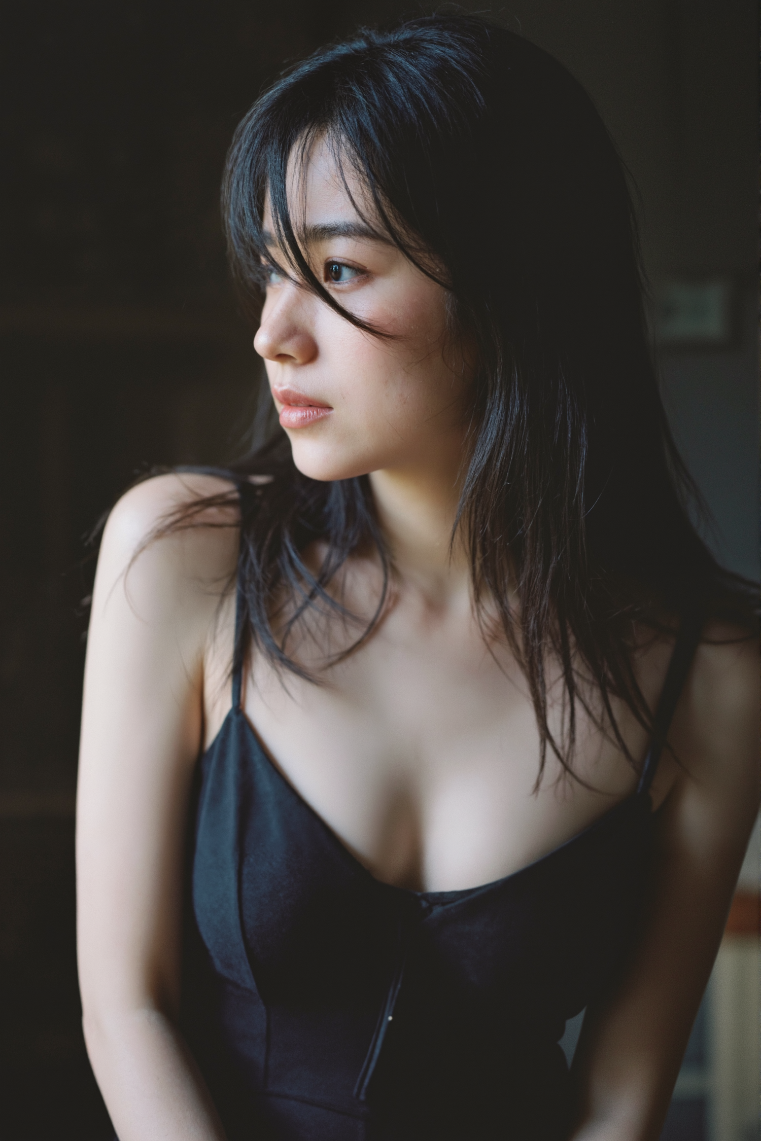 A contemplative Asian woman with long dark hair in a black top, gazing sideways in soft lighting against a dark background.