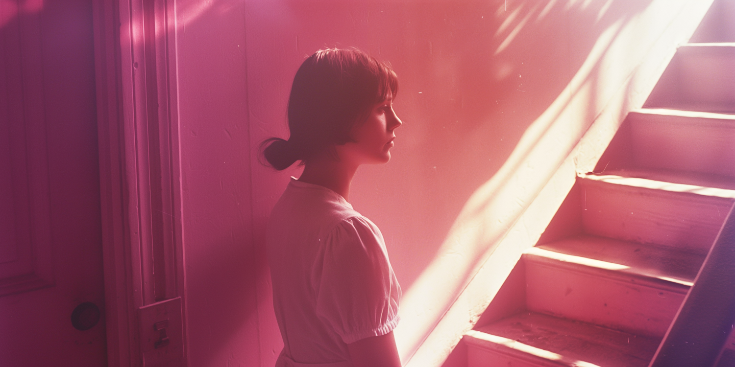 A young woman in a white dress stands in warm pink light by a staircase, creating a dreamy and ethereal atmosphere.