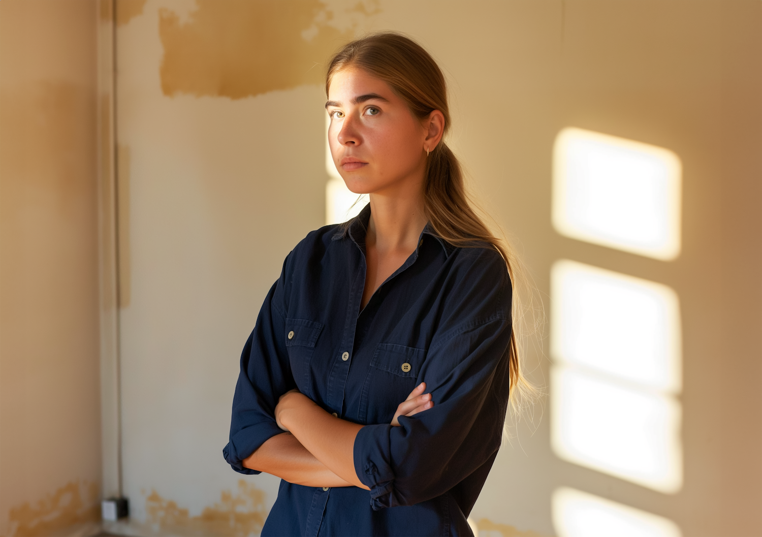 Confident young woman with long hair in a blue shirt, arms crossed, in a warmly lit room with sunlight patterns on the wall.