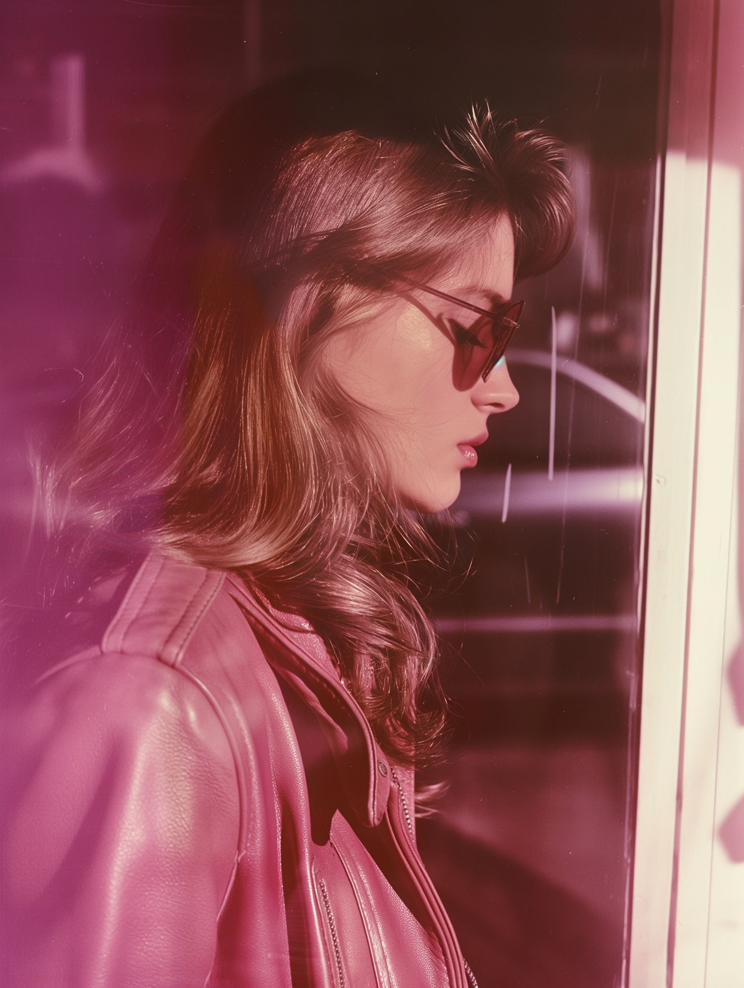 Stylish woman in pink leather jacket and sunglasses, bathed in warm pink light, gazes thoughtfully out a window.