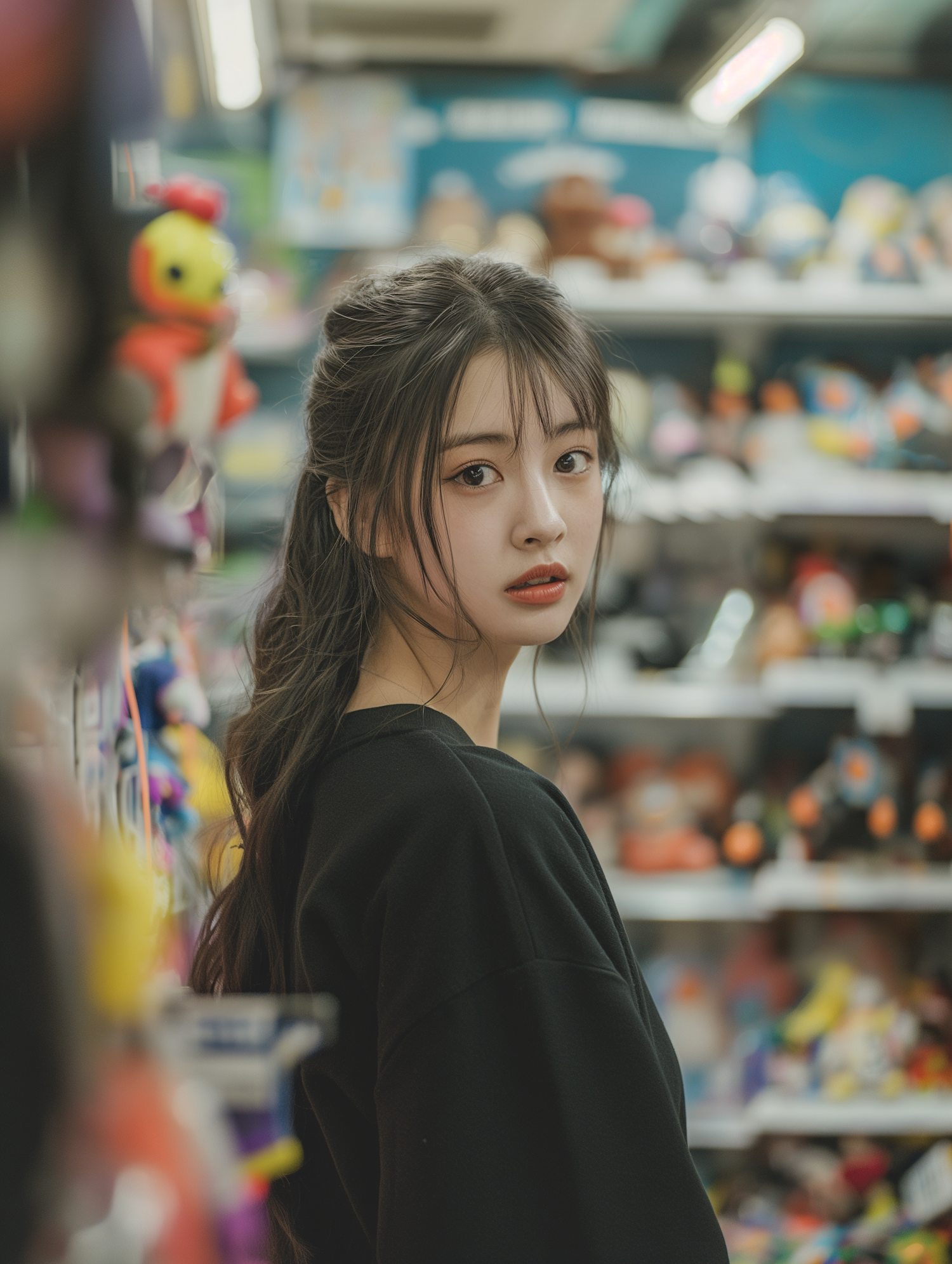 Asian woman with long dark hair in a toy store, wearing a black top, surrounded by colorful toys. Soft lighting highlights her calm expression.